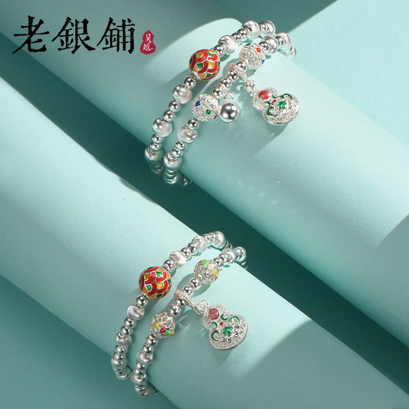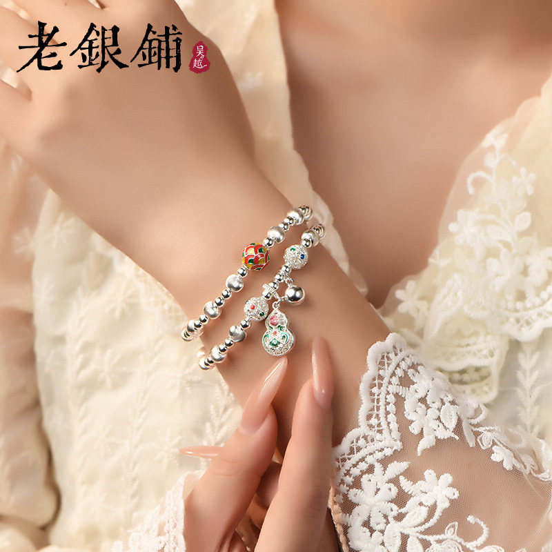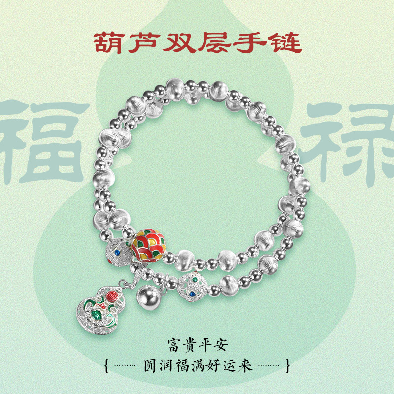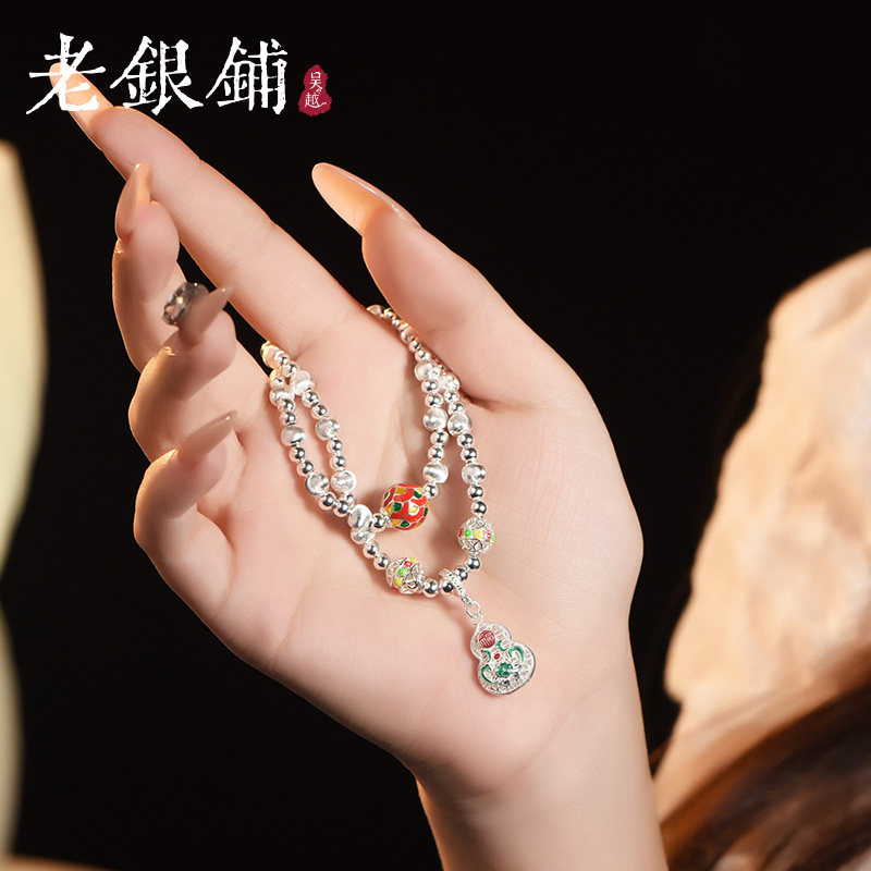 天猫吴越老银铺双圈纯银串珠手链足银福禄葫芦双层手串多圈轻奢手饰女