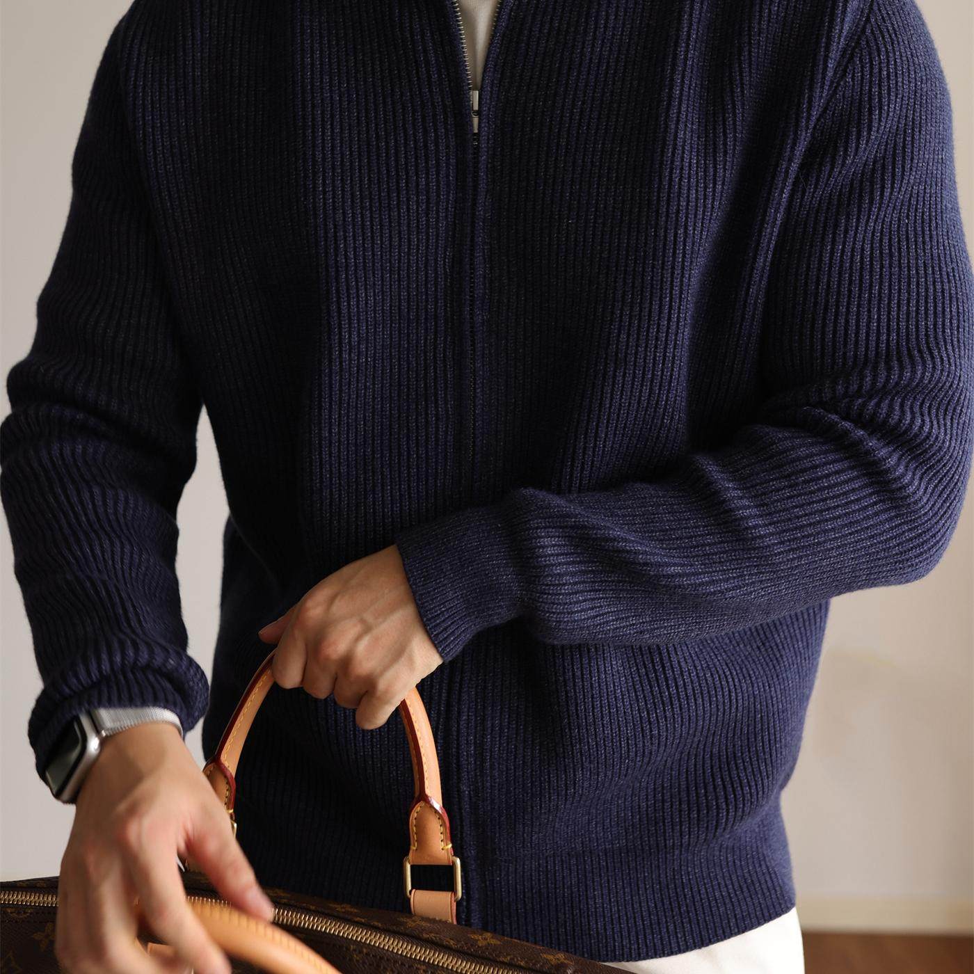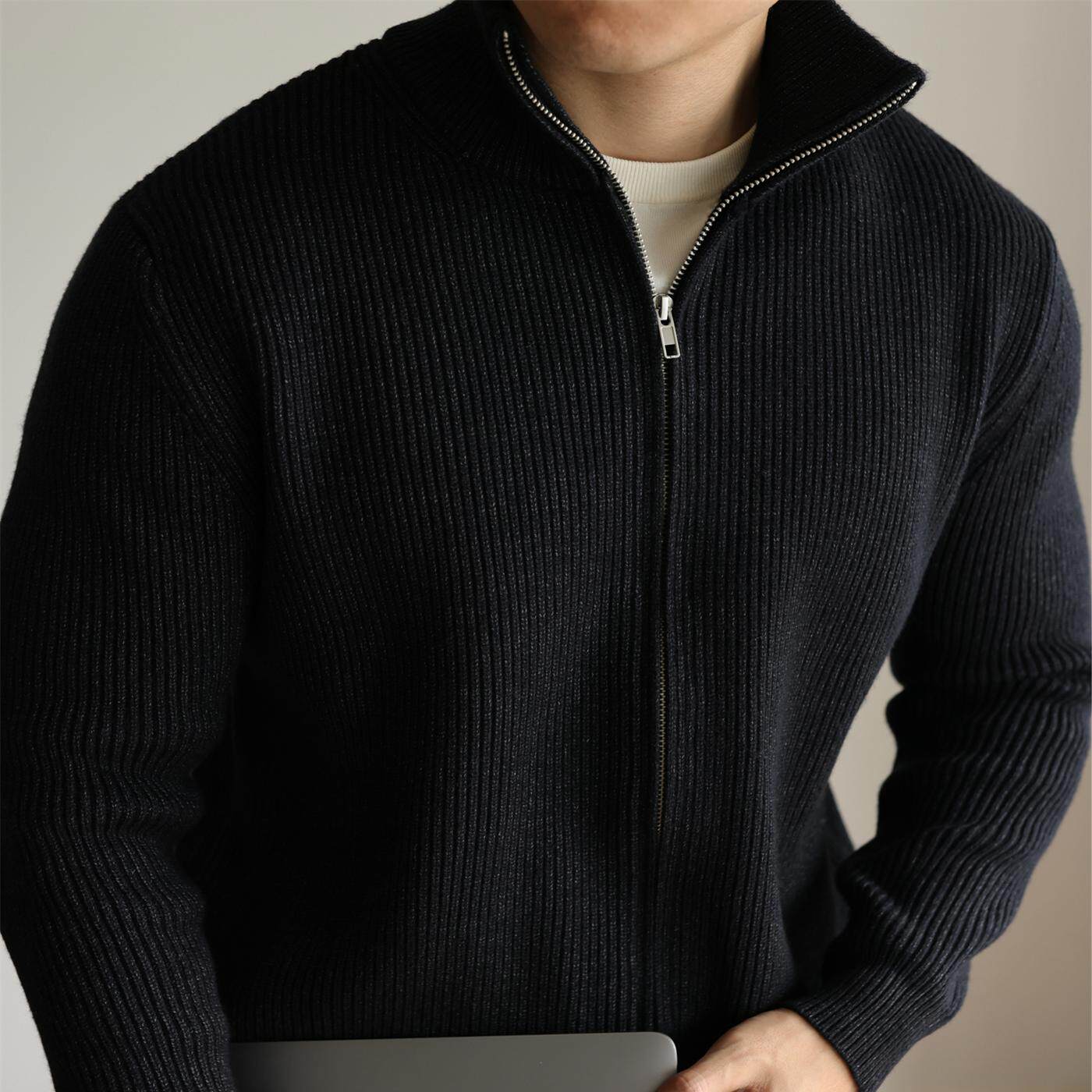 淘宝YUXIAN秋冬重磅坑条复古立领混纺拉链针织拉链毛衣外套保暖男士