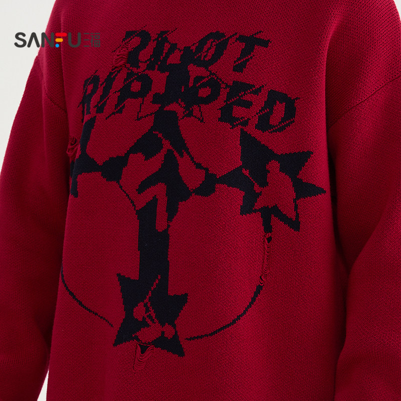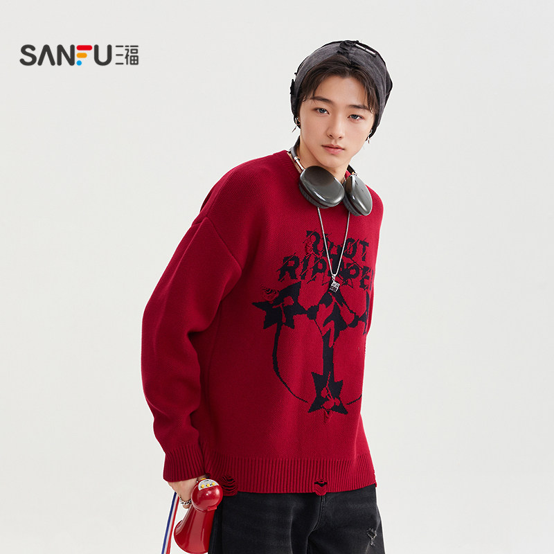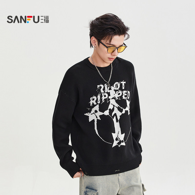 天猫三福2025冬季男士海胆头乐队图案毛衣 街潮破洞圆领上衣510803