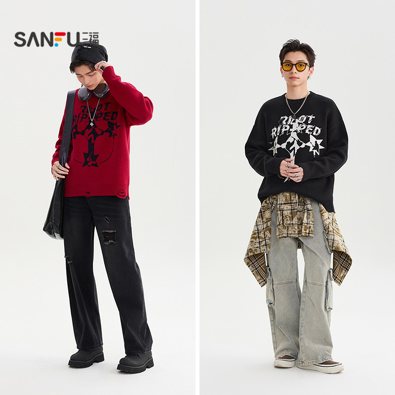 三福2025冬季男士海胆头乐队图案毛衣(款号:510803)是一款融合街头潮流与个性表达的时髦单品。采用柔软亲肤的针织面料,保暖舒适,适合秋冬穿搭。胸前个性十足的海胆头乐队图案设计,充满复古摇滚气息,彰显不羁态度。经典圆领剪裁搭配局部破洞工艺,增添随性不羁的潮流感,轻松打造酷帅型男造型。宽松版型包容性强,可搭配牛仔裤、工装裤或束脚裤,适用于日常出街、音乐节等多种场合。无论是叠穿还是单穿,都能展现独特的街头风格,是追求个性与时尚的男士冬季衣橱必备之选。