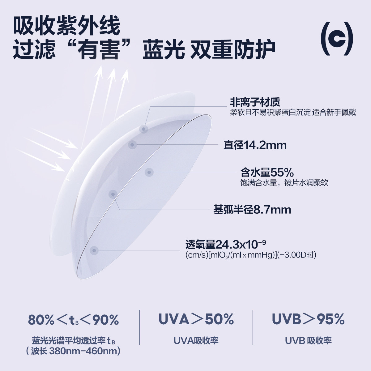COFANCY可糖滤蓝光透明隐形眼镜日抛30片,专为长时间面对电子屏幕的近视人群设计。采用先进水凝胶材质,镜片柔软亲肤,佩戴舒适透气,有效锁水保湿,全天保持双眼水润不干涩。独特的滤蓝光技术,可智能过滤有害高能蓝光,减轻视觉疲劳,保护眼睛健康。日抛设计免去护理烦恼,卫生便捷,避免细菌滋生。高透氧性确保角膜自由呼吸,适合日常通勤、办公及学习使用。30片装满足一个月用量,是追求舒适、健康与便捷的近视人士的理想选择。COFANCY可糖,让清晰视界更安心。