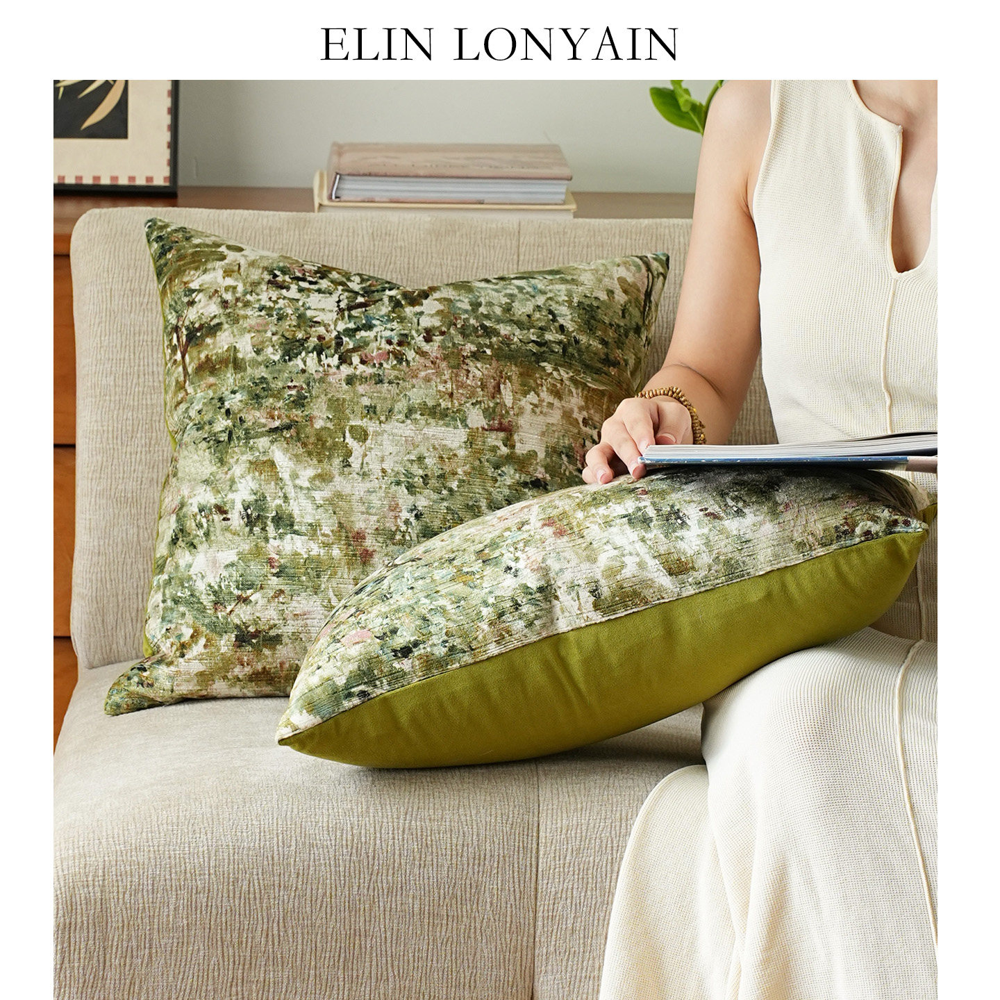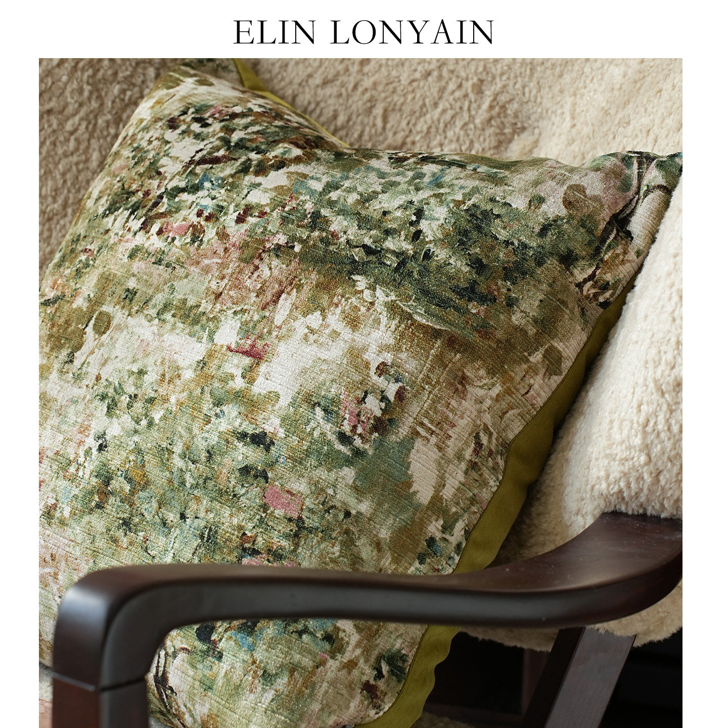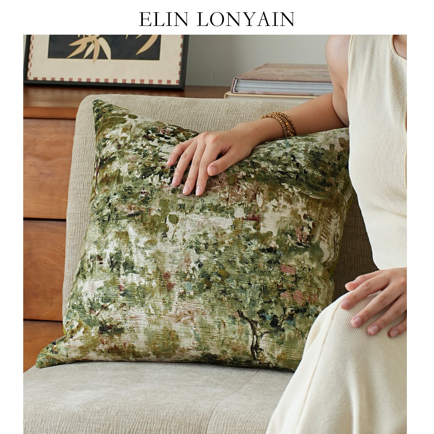 天猫珑衍家居法式莫奈绿色绒面印花靠垫抱枕样板房酒店民宿沙发方枕