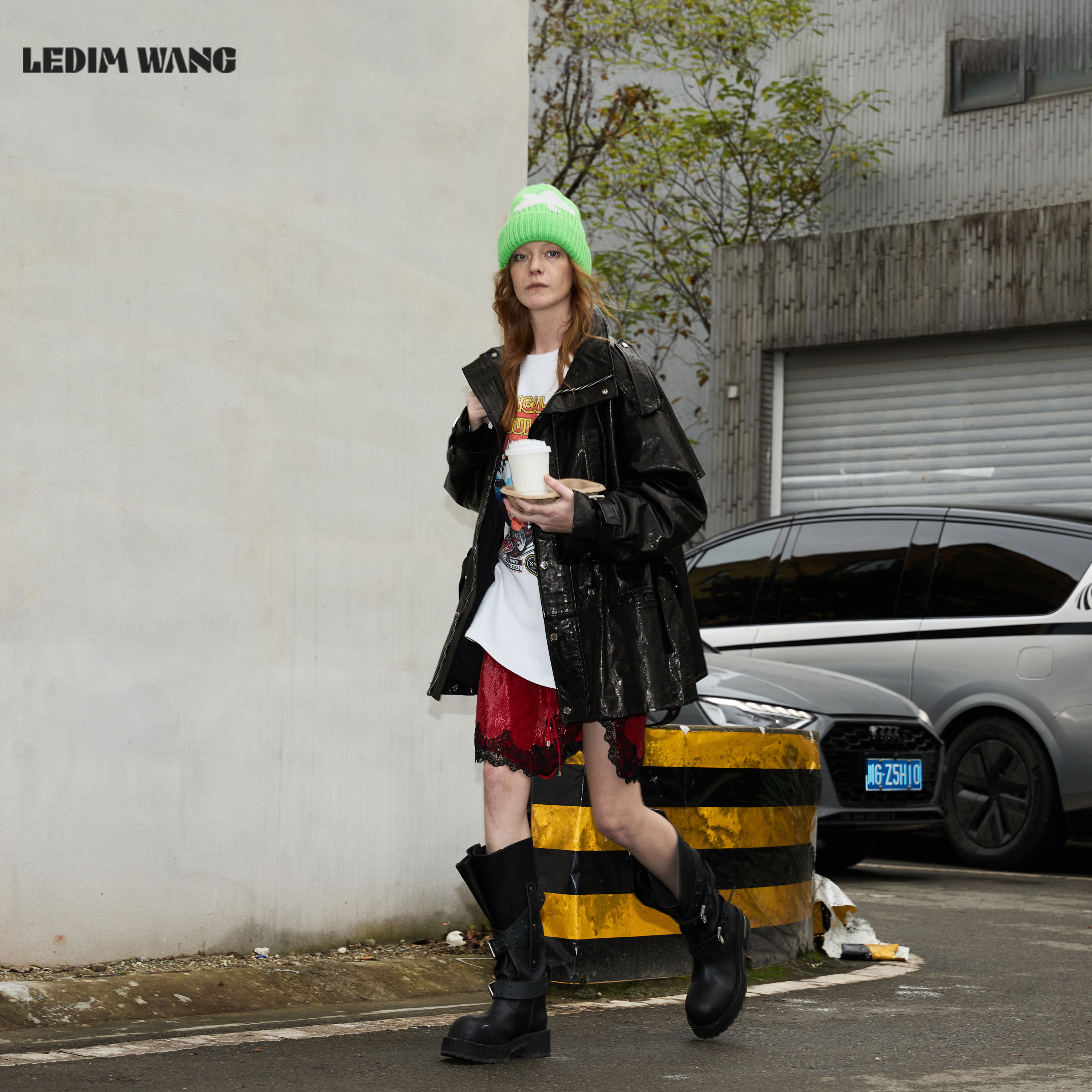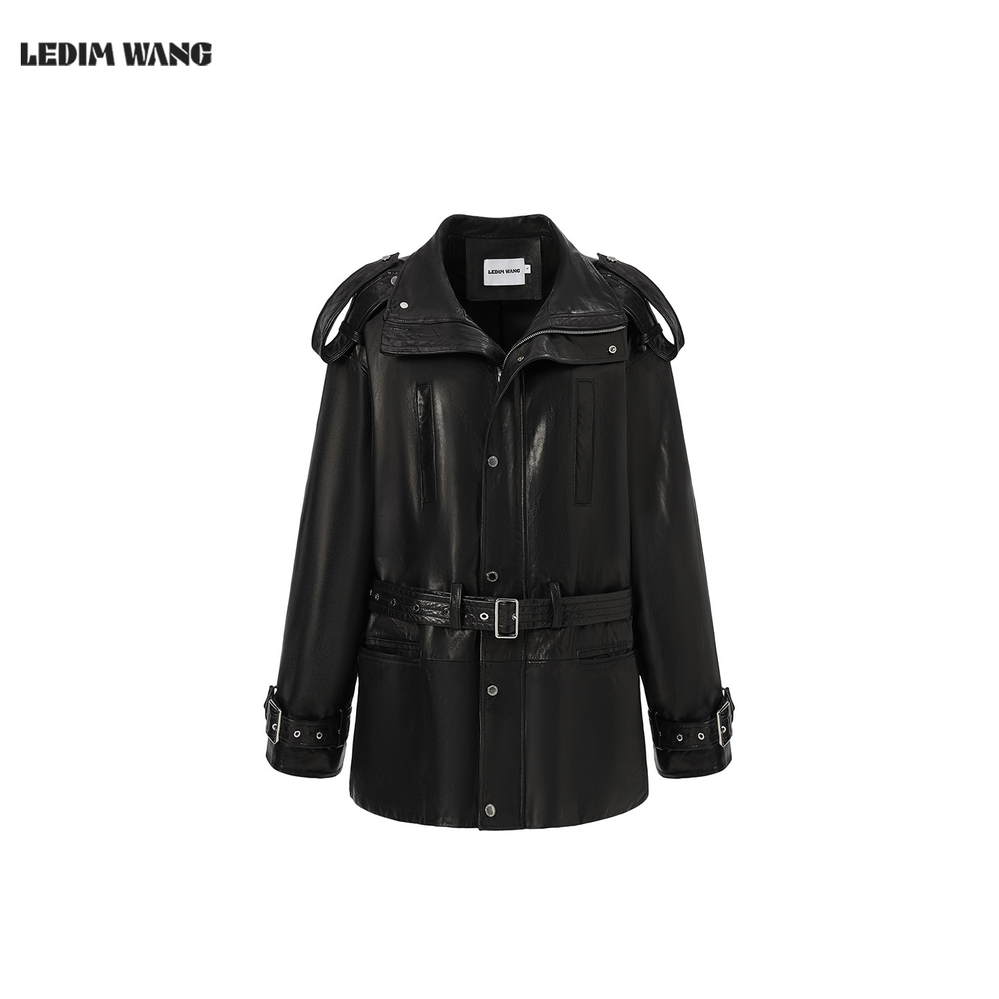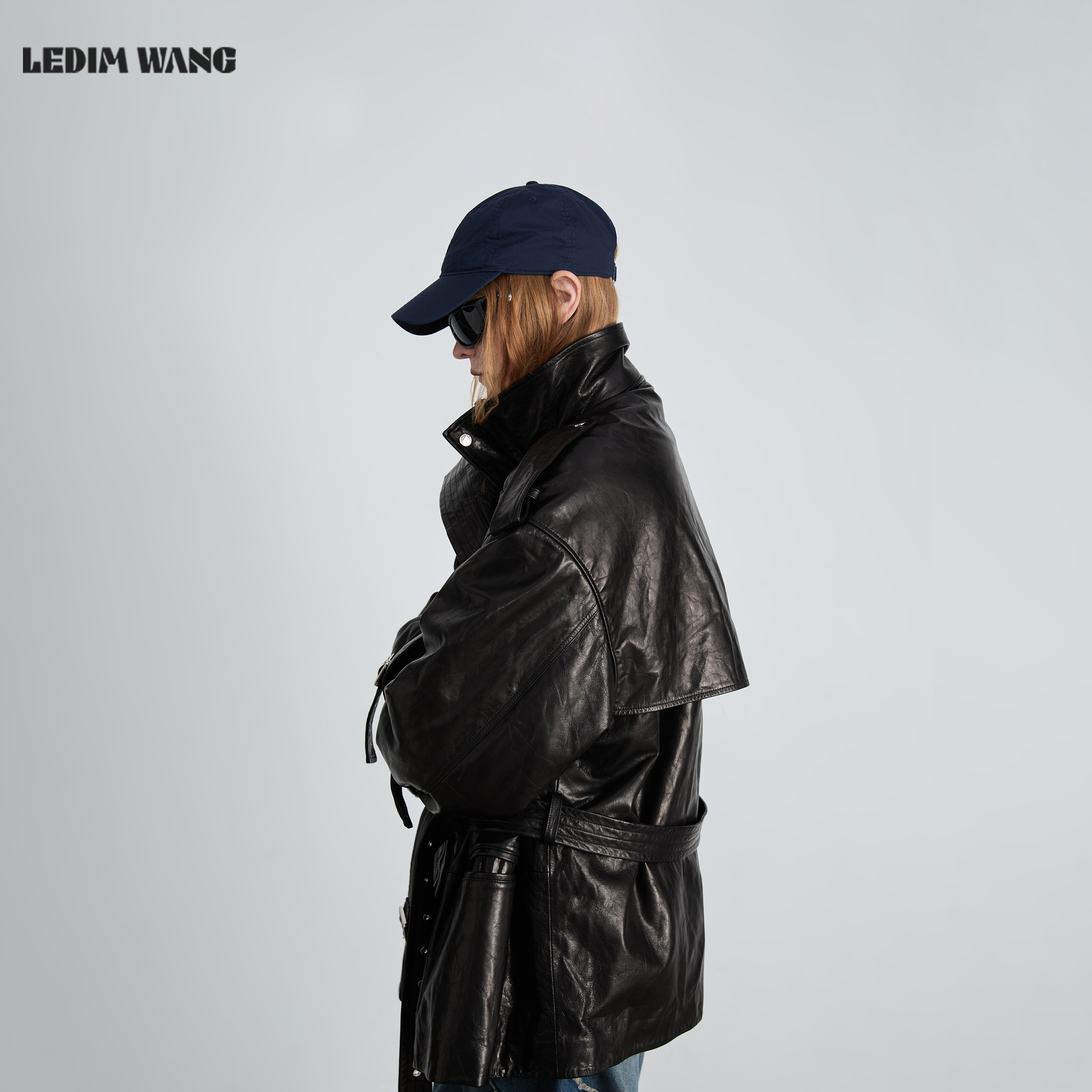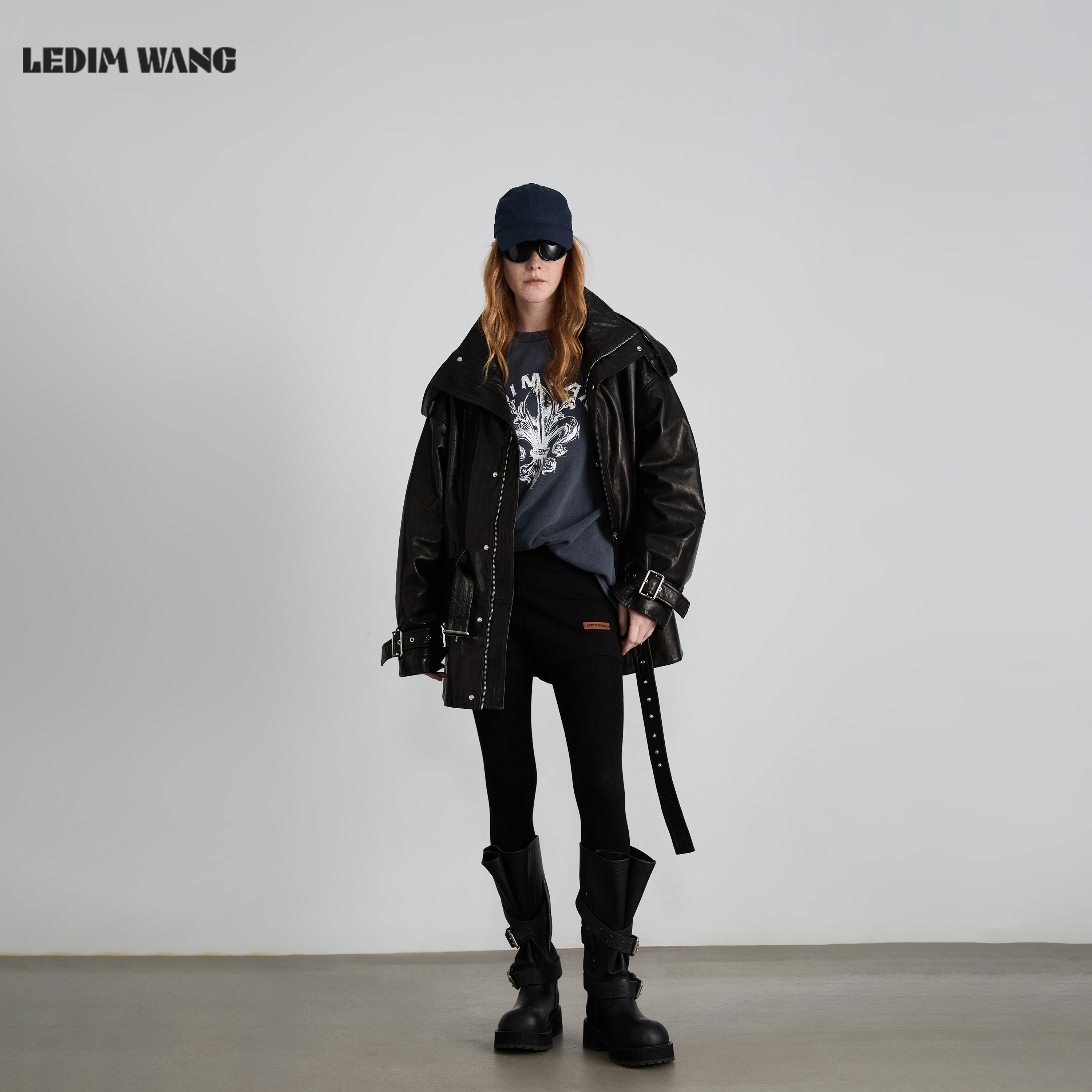 天猫LEDIM WANG小羊皮外套皮衣女25秋冬新款宽松夹克黑色驼绒棉服