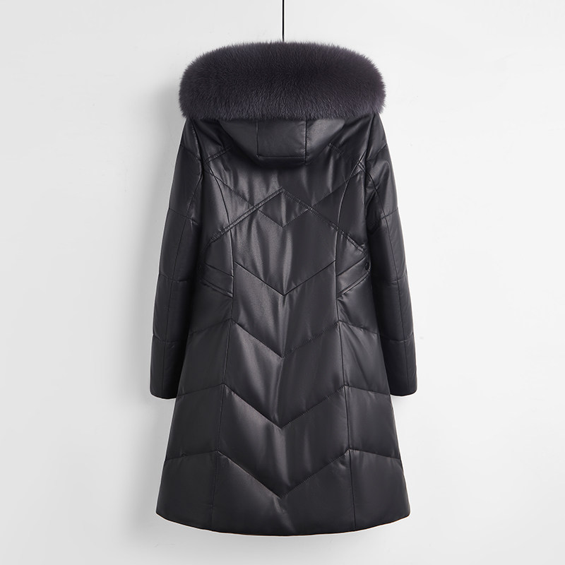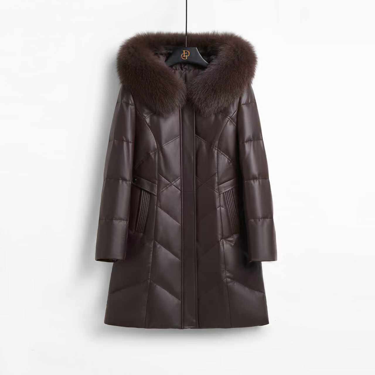 2025新款真皮鹅绒服女头层绵羊皮压花皮印花皮狐狸领中长款羽绒服