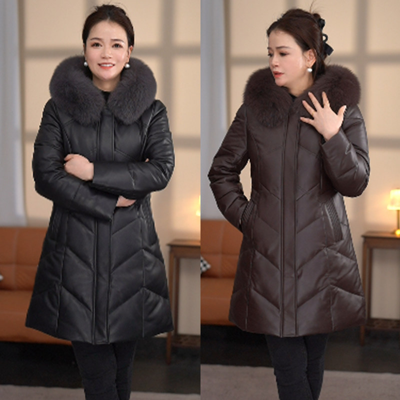 冬季新品进口油腊皮水貂领白鹅绒宽松皮衣欧货羽绒服中长外套女潮