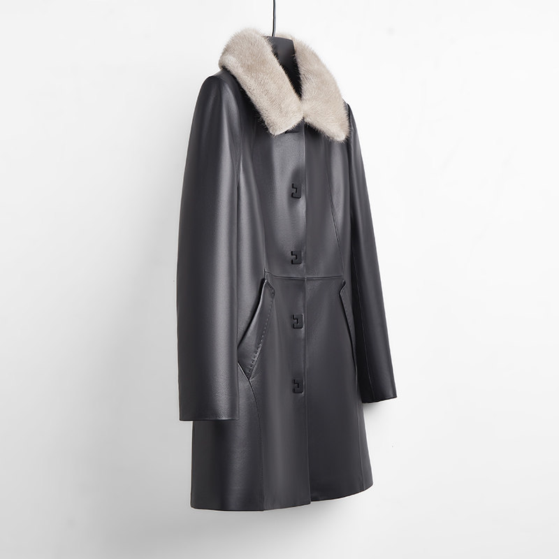 法歌弟海宁真皮皮衣女中长款,精选优质绵羊皮打造,质感细腻、柔软耐磨,兼具保暖与时尚。中长版型设计优雅显瘦,贴合女性身形曲线。内衬采用高品质羽绒服填充,轻盈保暖,适应寒冷季节。特别配备奢华水貂毛领,触感柔滑,提升整体档次。内胆可自由脱卸,一衣多穿,轻松应对不同温差需求。精致车缝工艺,细节考究,彰显品牌匠心。无论是日常通勤还是休闲出行,都能展现女性干练与优雅气质。法歌弟,以品质诠释经典,为现代女性打造兼具实用与美感的秋冬臻选。