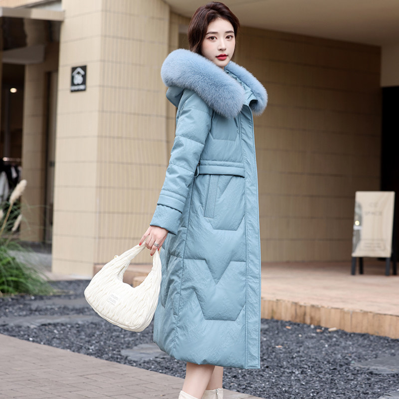 冬季新品进口油腊皮水貂领白鹅绒宽松皮衣欧货羽绒服中长外套女潮
