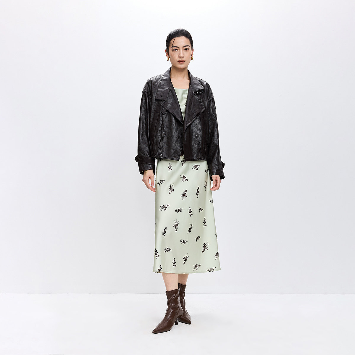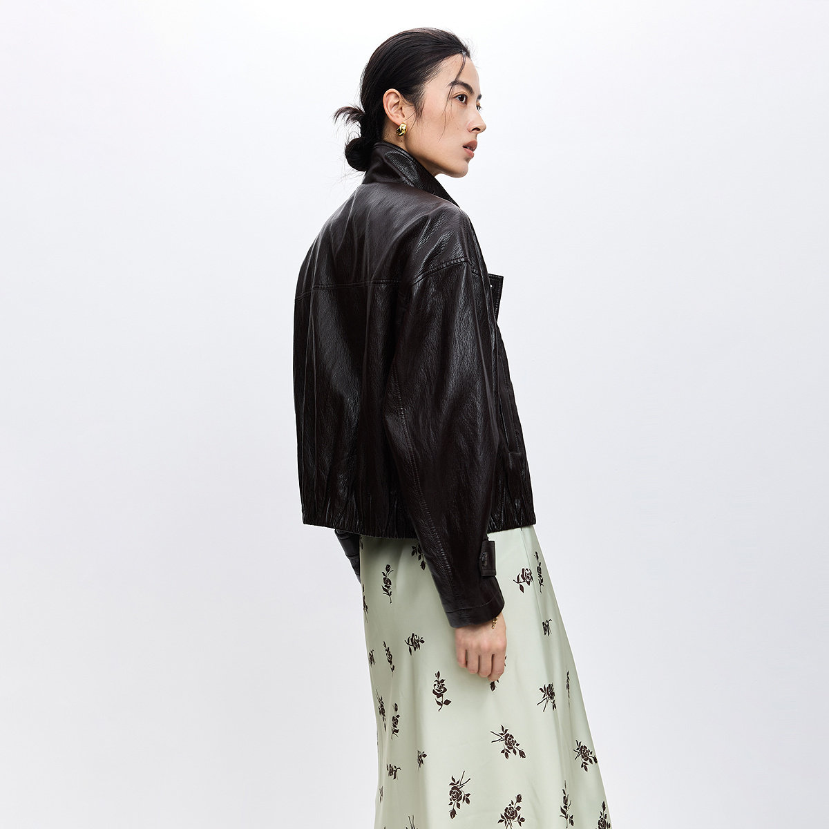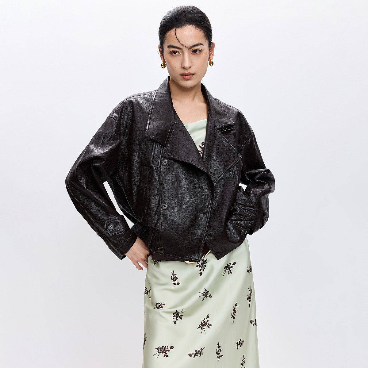 太平鸟早八夹克哑光肌理PU机车皮衣女复古廓形夹克外套女简约立领