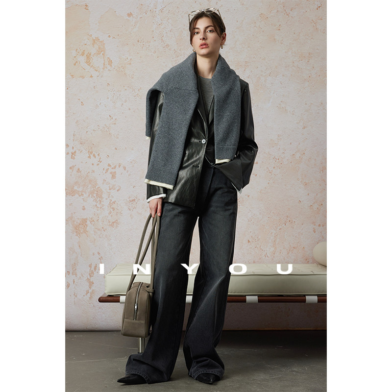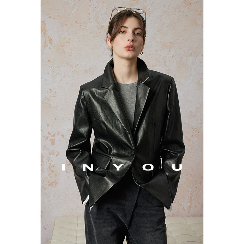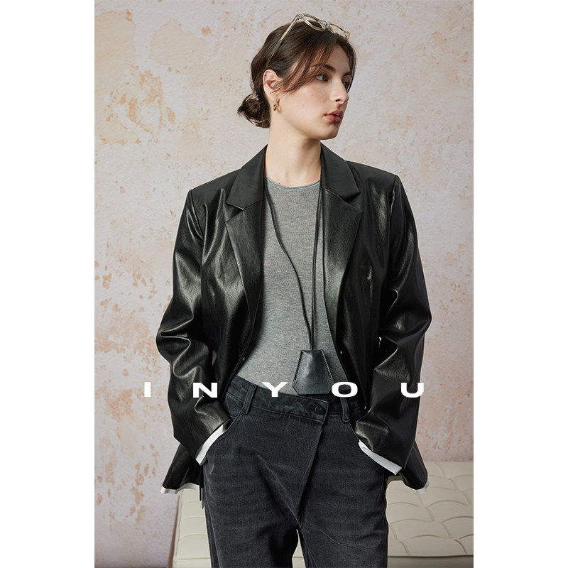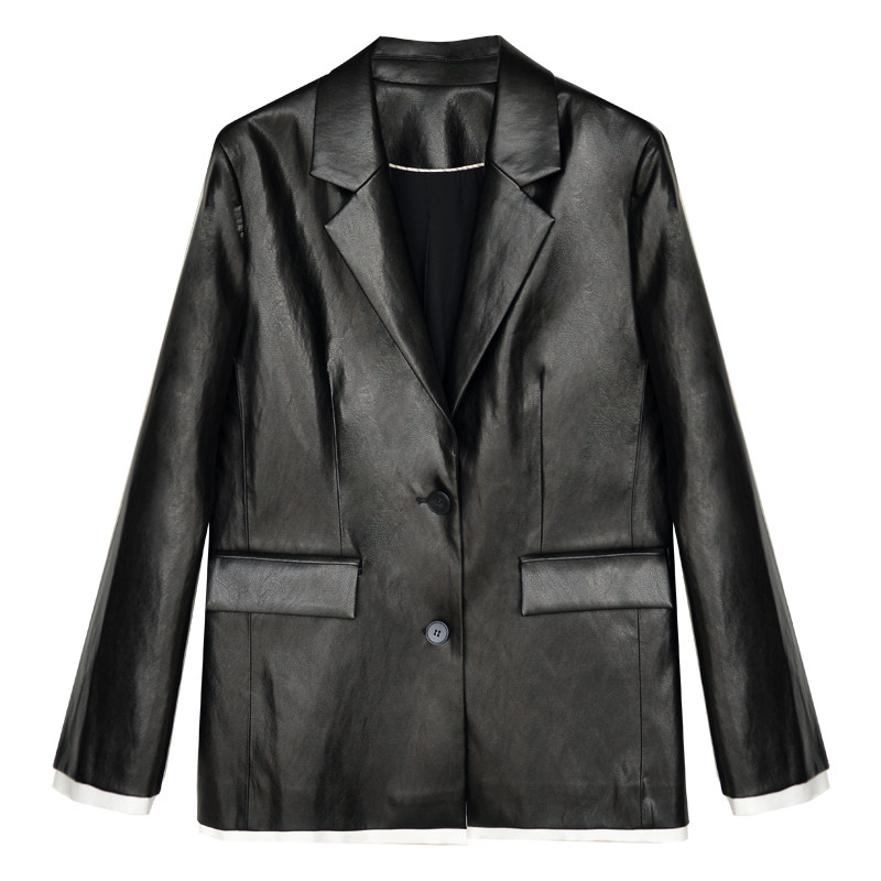 淘宝因由 黑色西装皮衣外套女老钱廓形平驳领上衣阔肩翻领秋冬西服