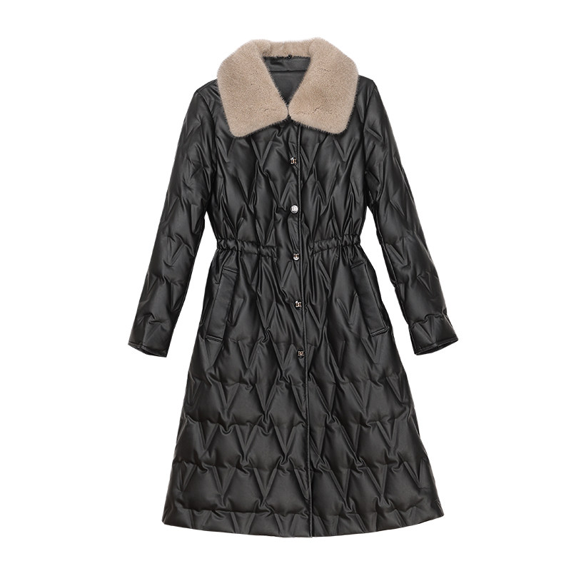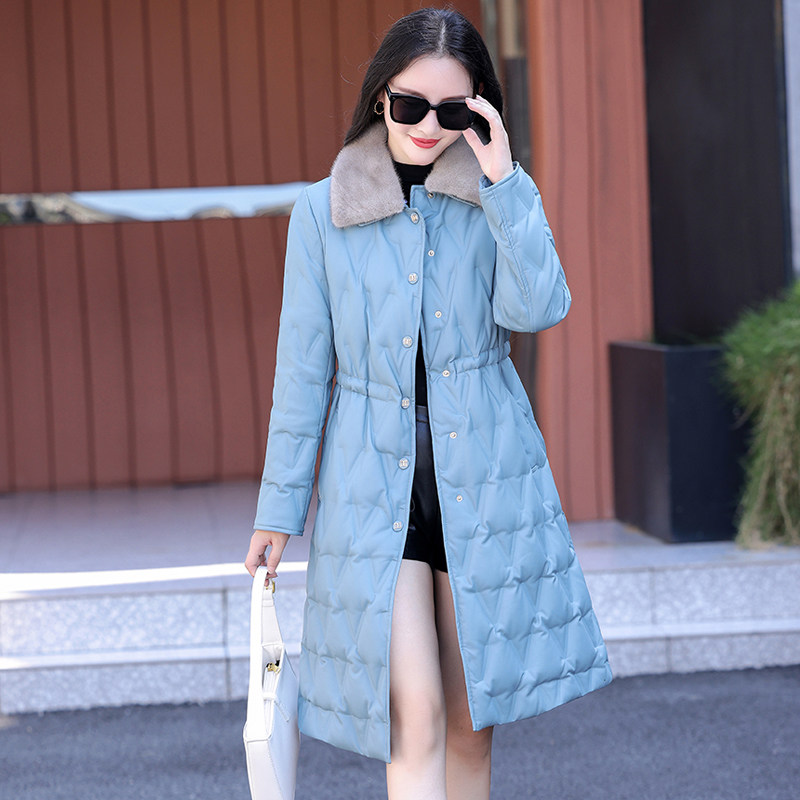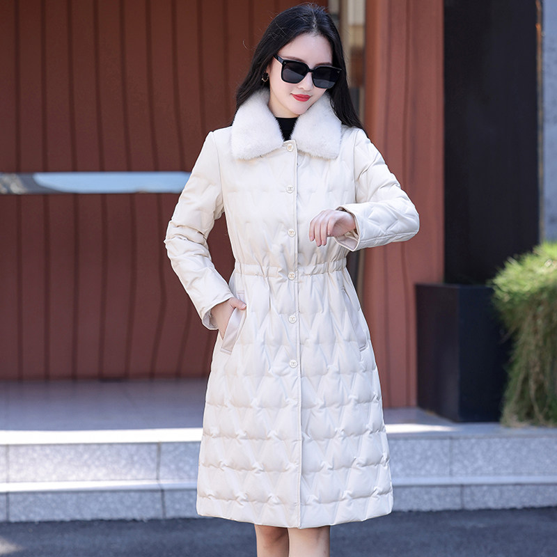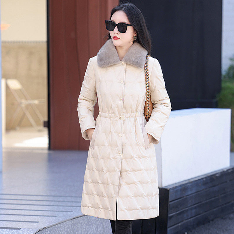 冬季新品进口油腊皮水貂领白鹅绒宽松皮衣欧货羽绒服中长外套女潮