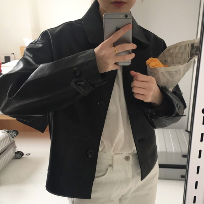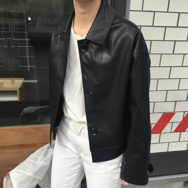 淘宝韩国chic秋季复古帅气翻领单排扣宽松休闲长袖机车服皮衣短外套女
