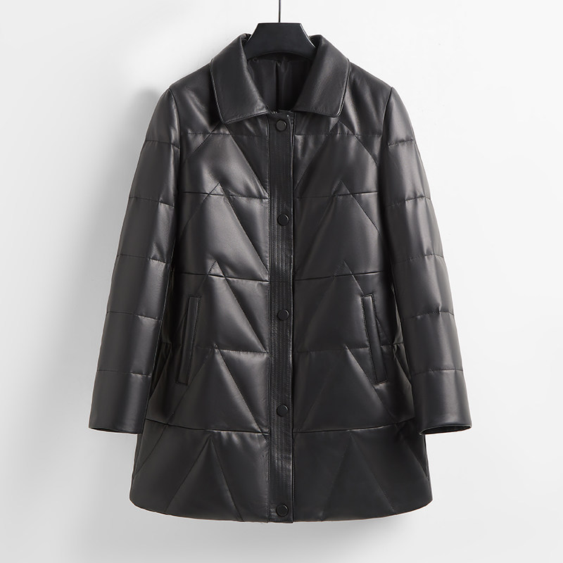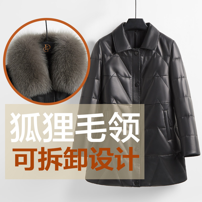 天猫法歌弟海宁真皮皮衣女白鹅绒2024秋冬季百搭外套加厚羽绒服中长款