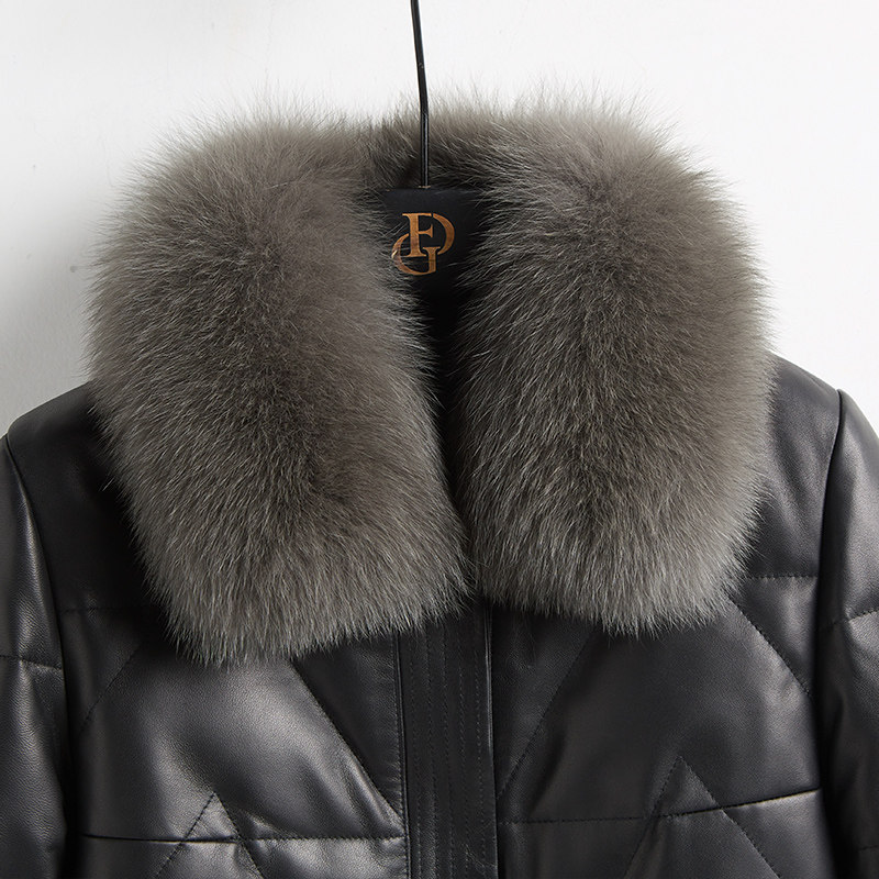 2025新款真皮鹅绒服女头层绵羊皮压花皮印花皮狐狸领中长款羽绒服
