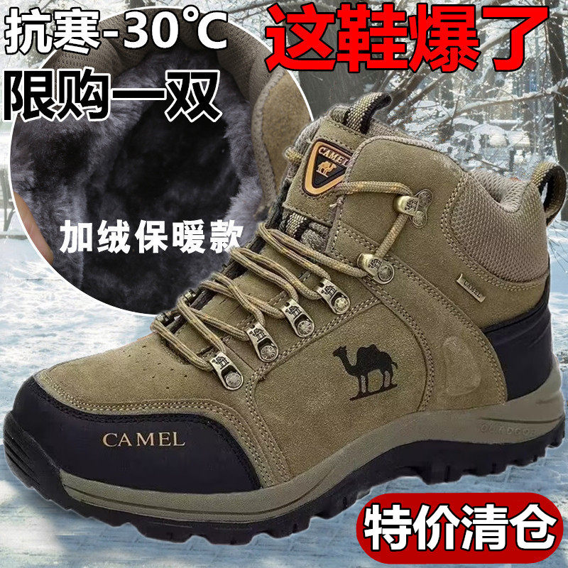 淘宝骆驼男鞋高帮加绒男士户外登山棉鞋清仓防滑冬季旅游休闲运动鞋女