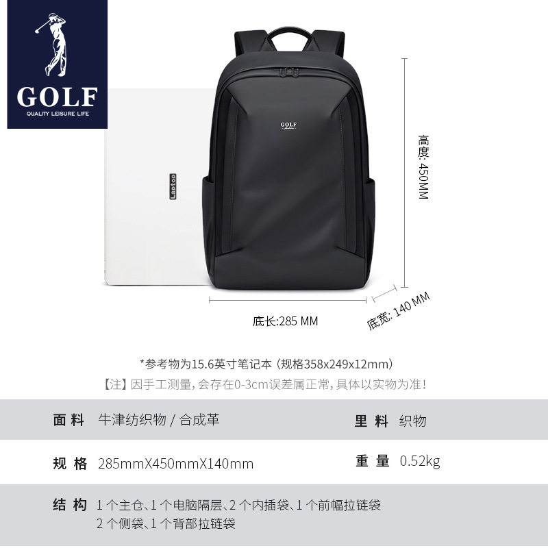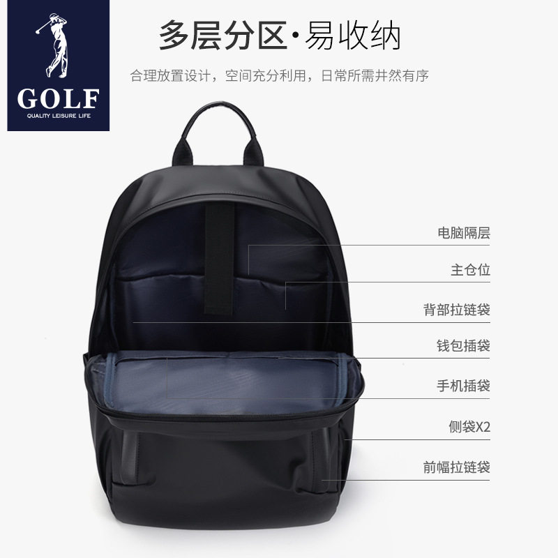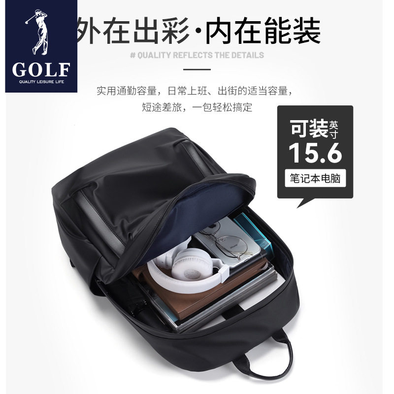 GOLF双肩包专为男士设计,融合商务与旅行双重需求,大容量主仓可容纳15.6英寸笔记本电脑,配备防震隔层,保护设备安全。多隔层布局合理,轻松收纳文件、文具、衣物及日常用品,满足高中、大学生学习通勤及短途出行需求。采用高密度耐磨面料,防水抗污,结实耐用;加厚透气背垫与可调节肩带,减轻背负压力,长时间背负依然舒适。简约大气的外观设计,适合职场、校园、旅行等多种场合,是实用与时尚兼具的理想选择。无论是日常上课、商务出差还是周末出游,GOLF双肩包都能轻松应对,展现从容自信的男性魅力。