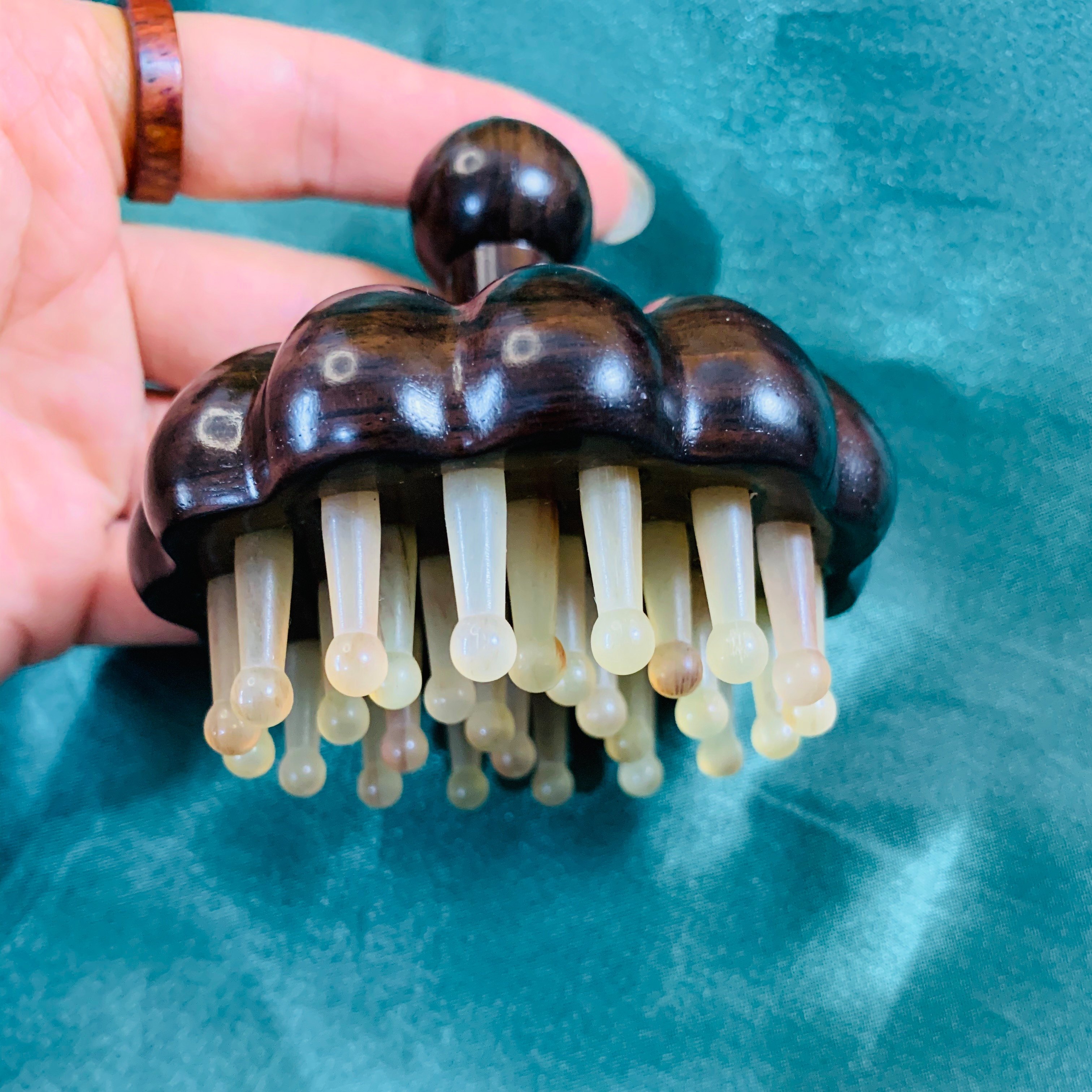 紫光檀羊角经络梳,精选天然紫光檀木与优质羊角制成,融合传统中医经络理念与现代养生需求。其南瓜造型手持设计,握感舒适,便于操作。梳齿圆润光滑,贴合头皮与背部曲线,可轻柔刺激头部、肩颈及背部穴位,促进血液循环,缓解疲劳,舒缓压力。适用于日常头部按摩、推背理疗及经络疏通,兼具实用与收藏价值。紫光檀木质坚硬细腻,久用愈显温润光泽;羊角部分天然抗菌,安全亲肤。是一款集美观、健康与实用于一体的传统养生器具,适合家庭自用或馈赠亲友。