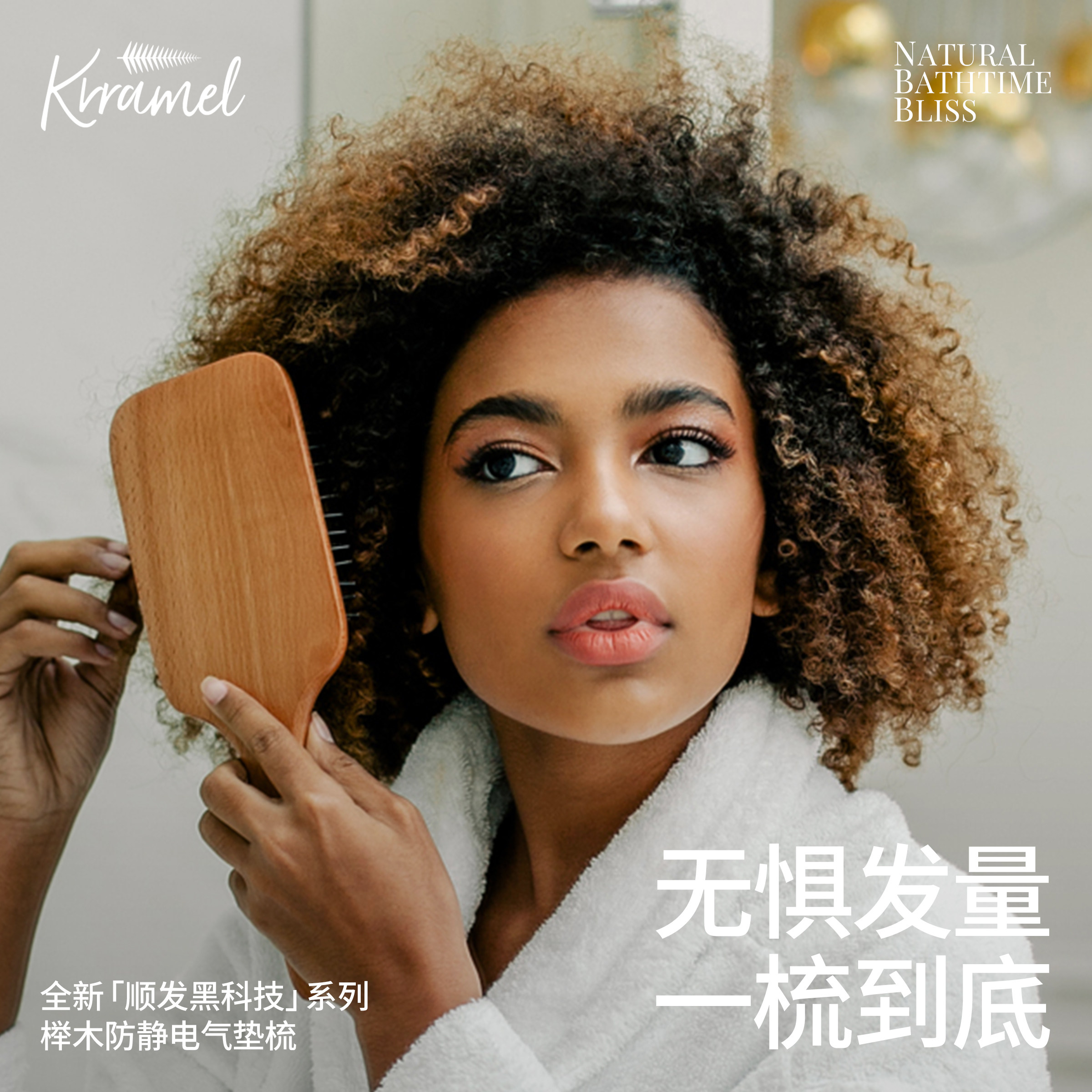 KRRAMEL梳子是一款来自美国进口的全新升级款气垫按摩梳,采用天然优质木材精心打造,兼具美观与实用性。其独特的高颅顶蓬松设计,能有效撑起发根,打造立体蓬松发型,特别适合细软发质人群。内置高弹性气垫,配合圆头梳齿,轻柔按摩头皮,促进血液循环,缓解疲劳。同时具备出色的防静电功能,减少头发毛躁与打结,让秀发顺滑易梳理。无论是日常造型还是头皮护理,KRRAMEL气垫梳都能带来舒适体验,是追求健康美发人士的理想之选。