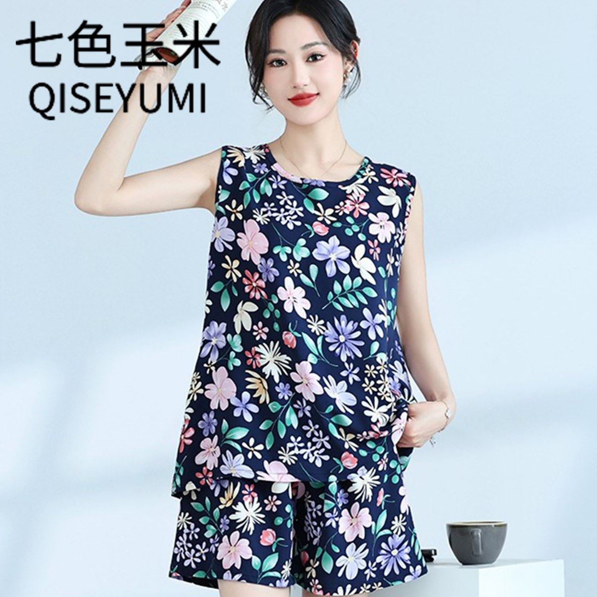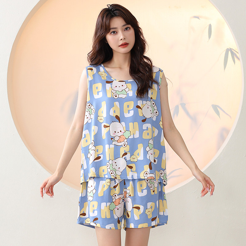 淘宝夏季女士棉绸睡衣中青年背心短裤两件套妈妈人造棉家居服套装外穿