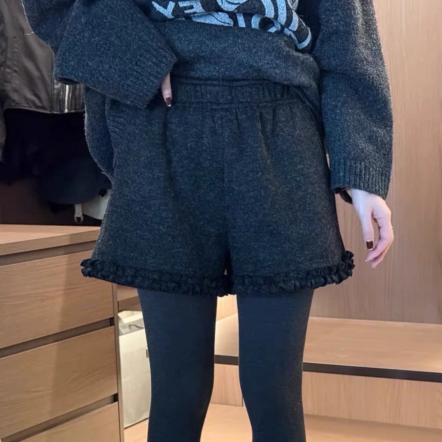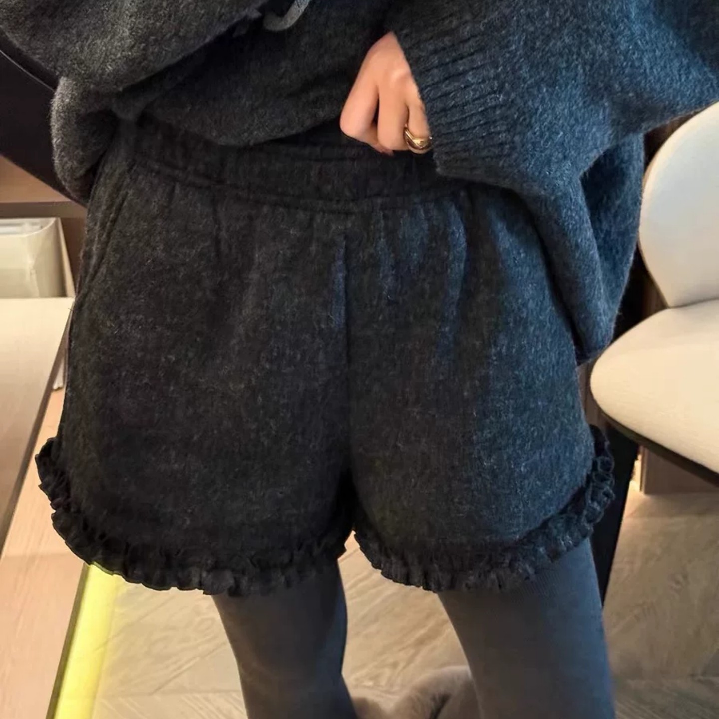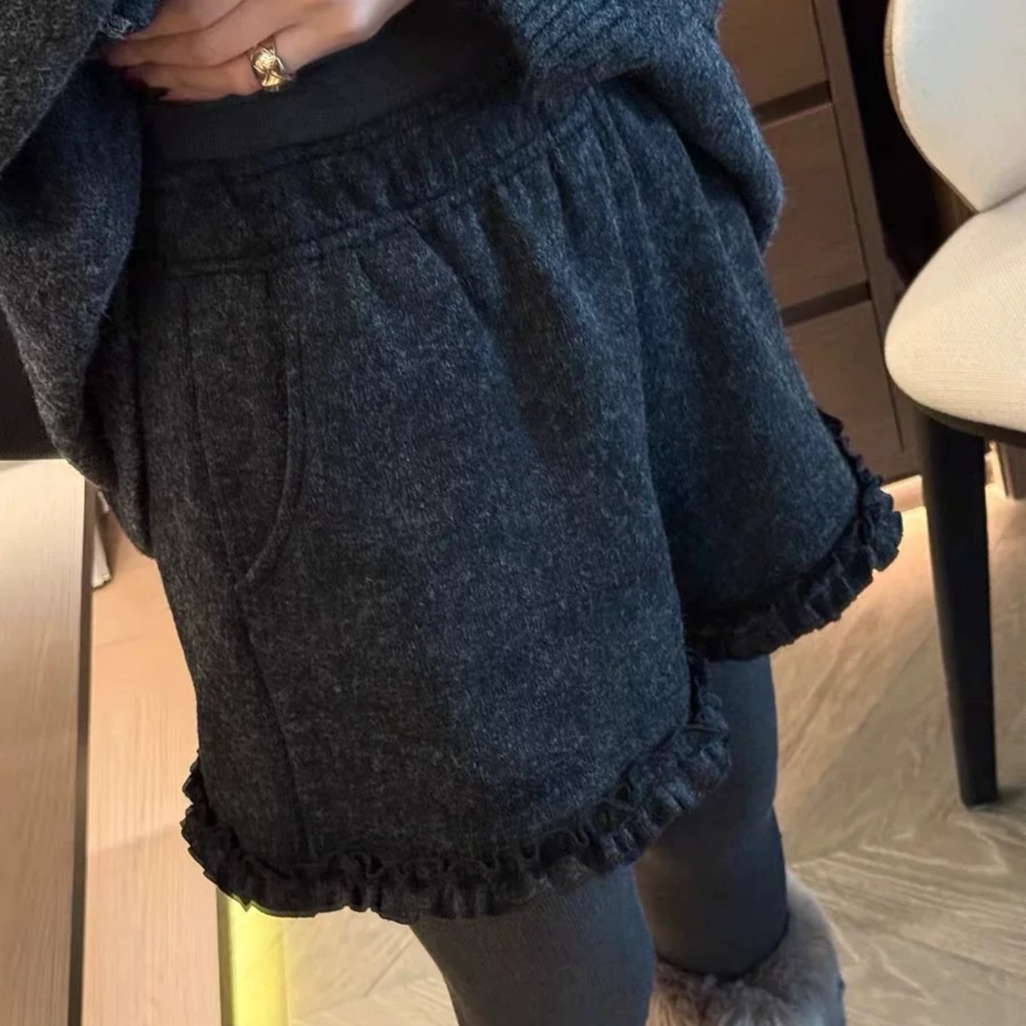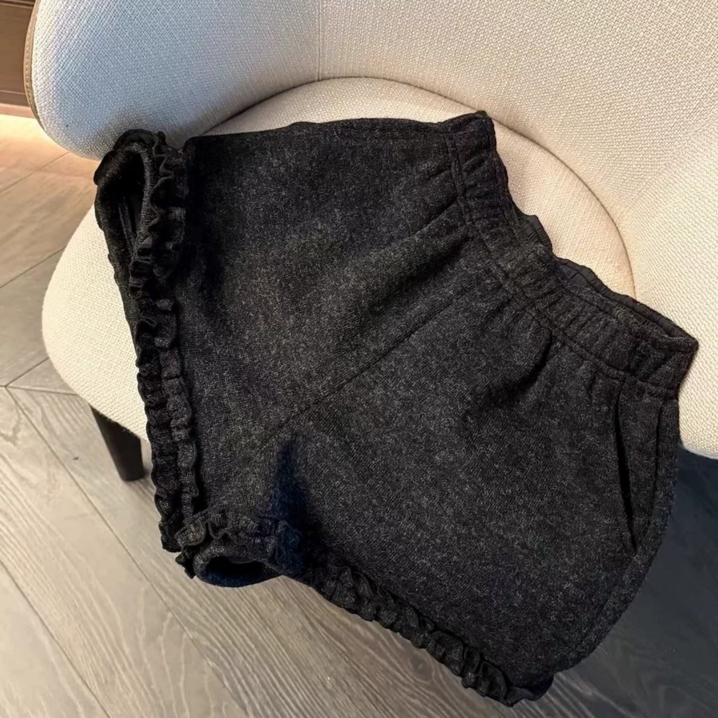 深灰色羊绒呢短裤女2025年冬季新款加绒宽松休闲木耳边阔腿靴裤