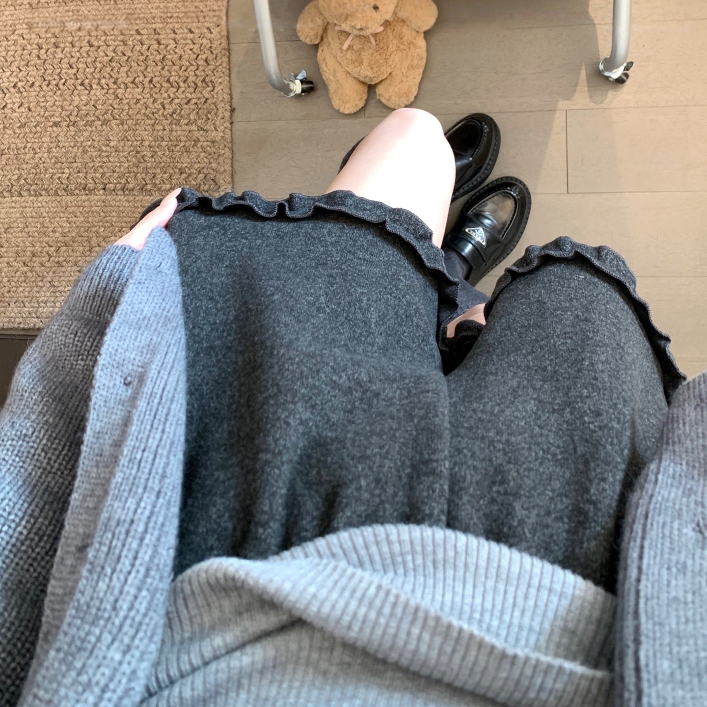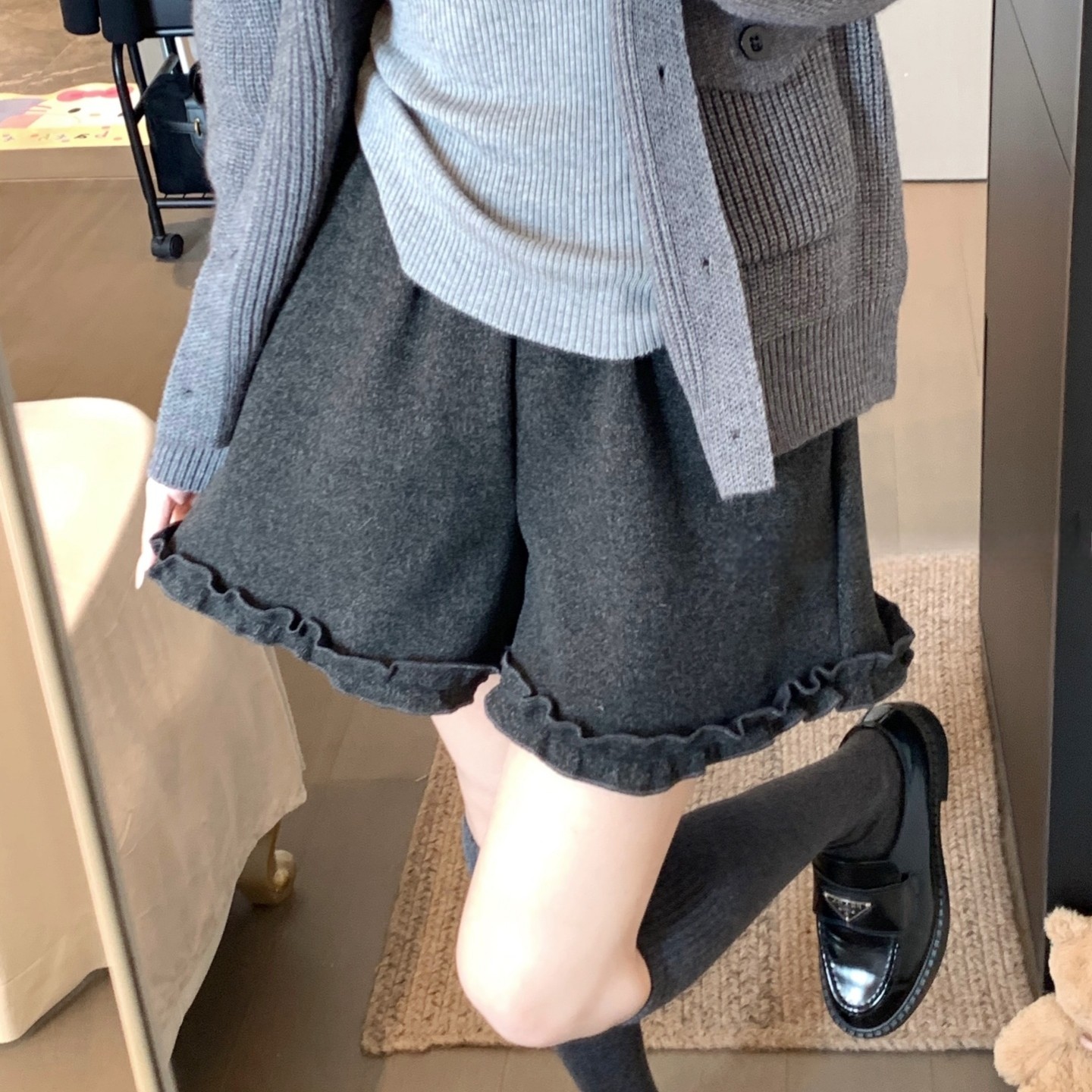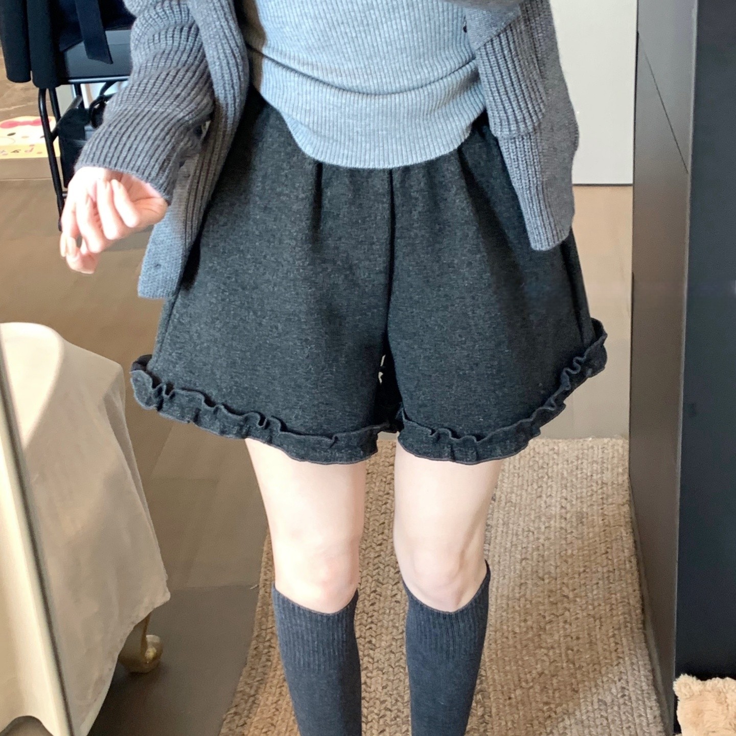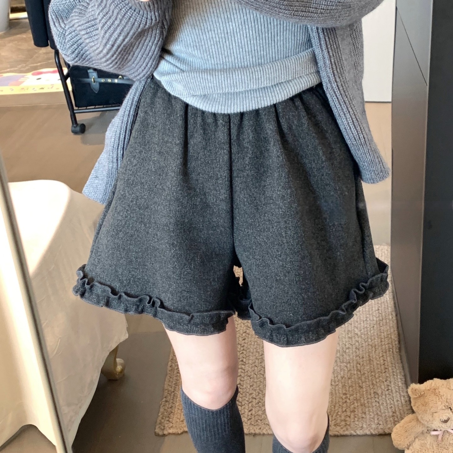 深灰色羊绒呢短裤女2025年冬季新款加绒宽松休闲木耳边阔腿靴裤