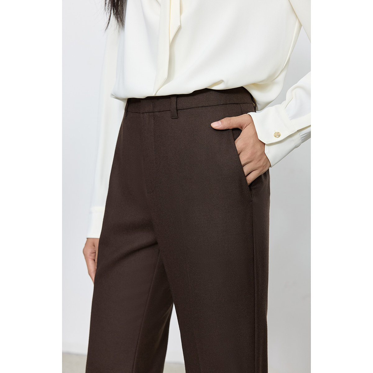 LILY2025新款绵羊毛复古老钱风修身通勤咖啡色微喇西裤,融合经典与时尚,专为都市女性打造。精选优质绵羊毛面料,触感柔软、垂坠有型,兼具保暖性与高级质感。复古“老钱风”设计低调优雅,咖啡色调沉稳百搭,轻松驾驭职场与日常场合。修身剪裁搭配微喇裤脚,巧妙修饰腿型,展现修长线条。高腰设计提升腰线,拉长比例,细节处彰显精致工艺。无论是搭配针织衫、衬衫还是西装,都能轻松演绎知性干练又不失松弛感的通勤造型,是2025年衣橱中不可或缺的优雅单品。