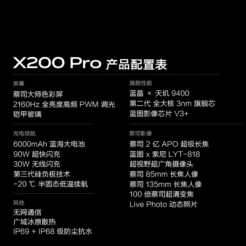 vivo X200 Pro 是一款搭载天玑9400旗舰芯片的全网通5G智能手机,性能强劲,能效出众。配备蔡司联合调校的2亿像素APO超级长焦镜头,支持专业级光学防抖与超清远摄,远近皆清晰,拍照体验全面升级。6.78英寸2K超感曲面屏,支持120Hz高刷与精准色彩还原,视觉沉浸感极佳。内置5500mAh大电池,支持100W闪充与50W无线快充,续航无忧。现享受政府补贴15%自营优惠,性价比再提升,是追求高性能与专业影像用户的理想之选。