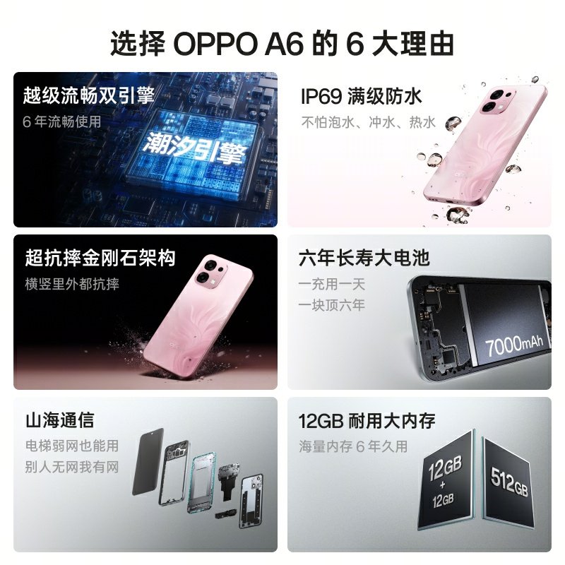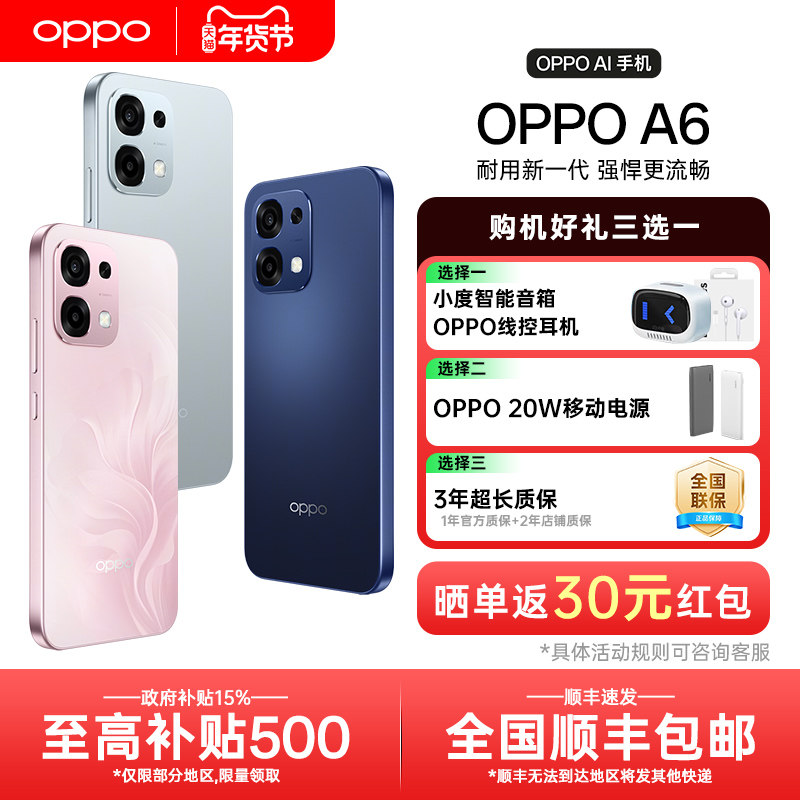OPPO A6 是OPPO官方旗舰店推出的全新5G全网通智能手机,现已正式上市。该机型搭载高性能处理器,支持双模5G网络,运行流畅,续航持久,适合学生、老人及日常使用人群。配备高清大屏与智能拍照系统,操作简洁,功能实用。目前享受政府补贴优惠,性价比极高。产品为官网正品,全国联保,品质有保障。无论是上网课、视频通话,还是日常娱乐,OPPO A6都能满足需求。新品上市期间,更有专属福利,欢迎前往OPPO官方旗舰店选购,体验科技与实惠的双重惊喜。