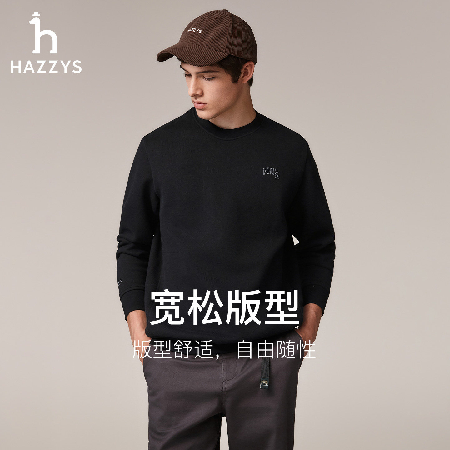 天猫Hazzys哈吉斯秋季圆领卫衣男装休闲通勤简约纯色上衣潮流宽松T恤