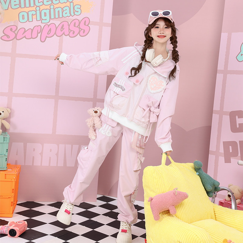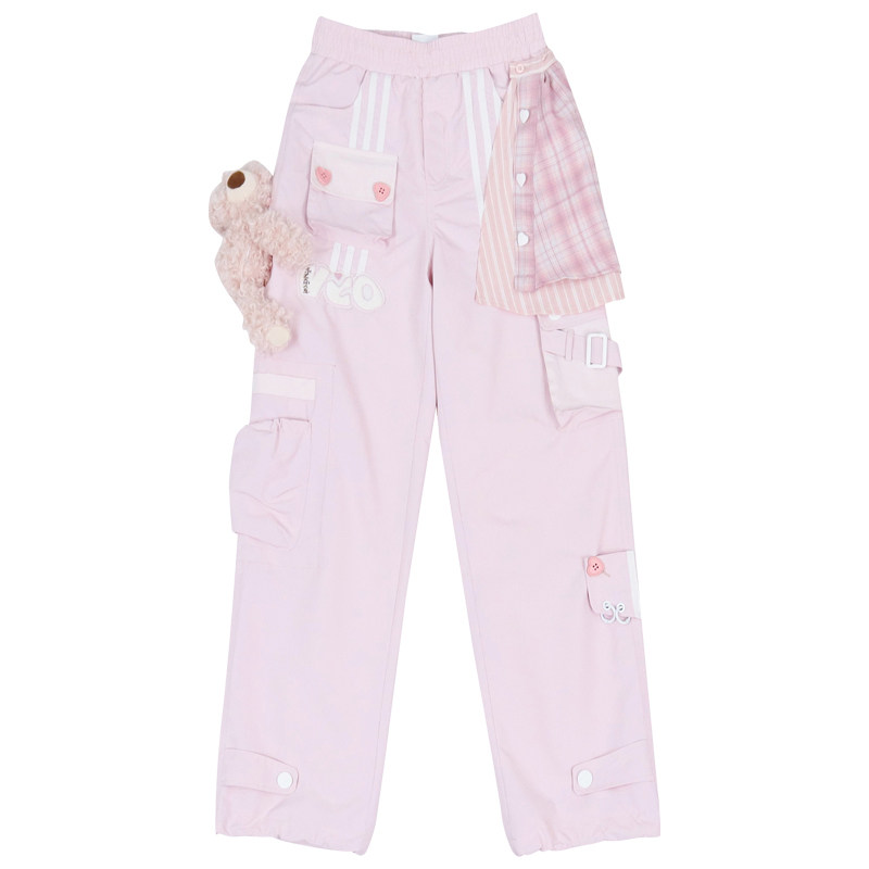 淘宝25秋格子解构松紧腰多口袋运动户外冲锋裤粉色长裤防晒裤工装裤女