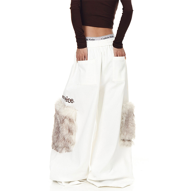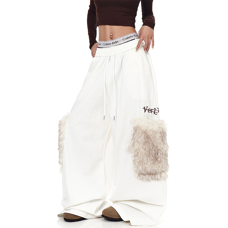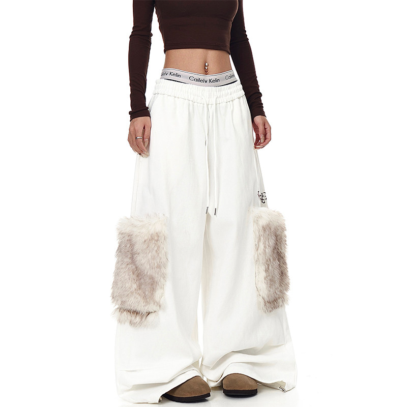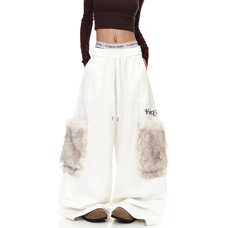 淘宝美式复古毛绒大口袋褶皱工装裤女冬季加绒加厚宽松休闲阔腿卫裤潮