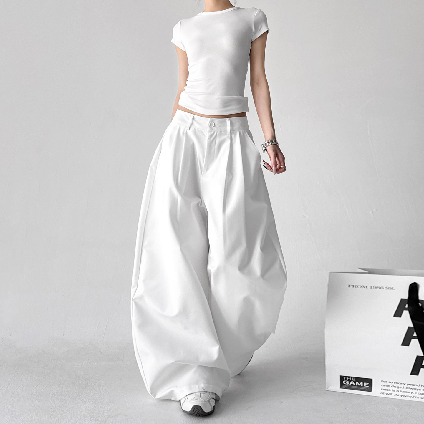 2026春季新款简约风白色高腰工装裤,以宽松慵懒的设计语言诠释现代女性随性而不失格调的穿搭态度。采用高品质挺括面料,垂感自然,白色基调清新百搭,轻松驾驭春日多种造型。高腰剪裁拉长腿部线条,工装口袋设计兼具实用性与时尚感,融合西装裤的利落轮廓与休闲裤的舒适体验。无论是搭配简约T恤、针织衫,还是小西装,都能轻松打造都市极简风格。独特而不张扬,是追求质感与舒适并重的现代女性的理想之选,为春日衣橱注入一抹清爽高级感。