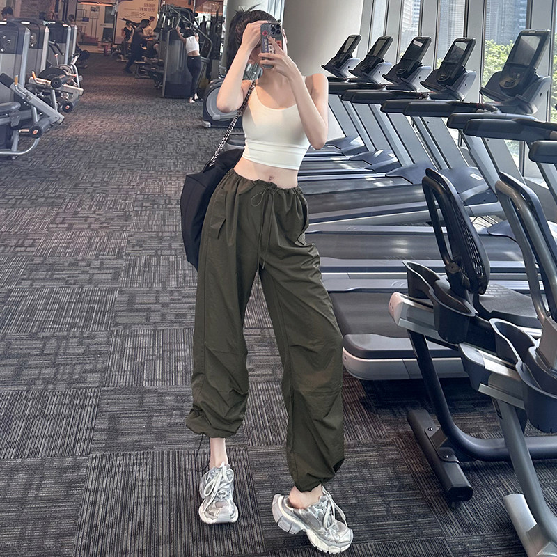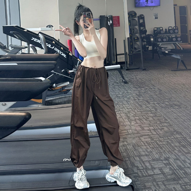 淘宝健身女孩抽绳工装运动裤户外休闲宽松专业瑜伽跑步训练束脚长裤新