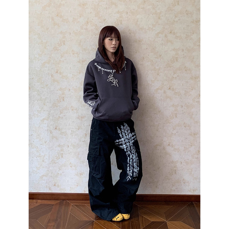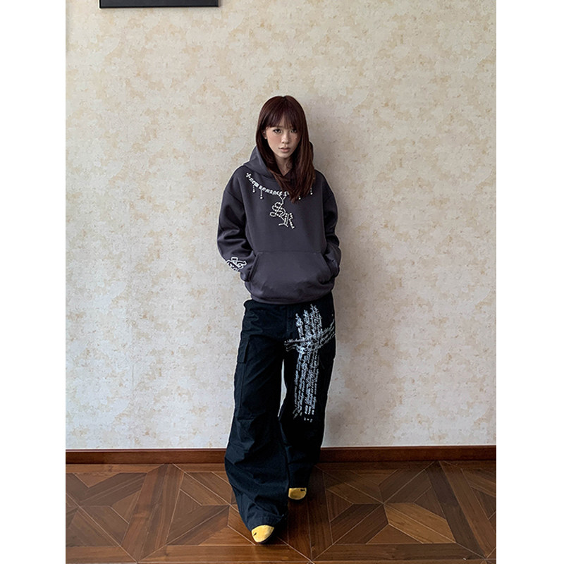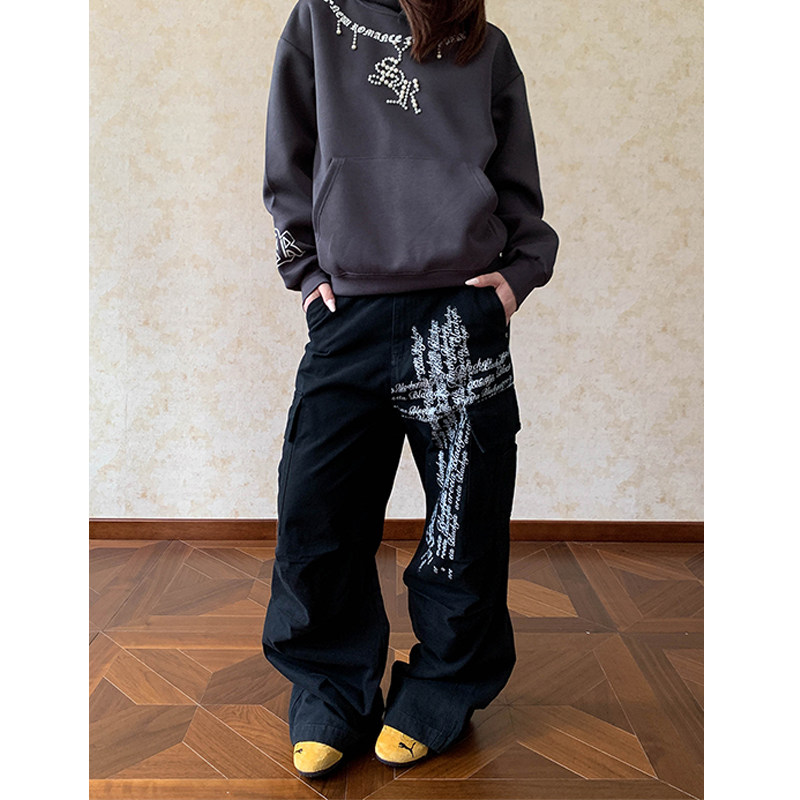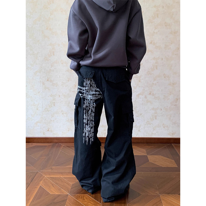 淘宝美式复古多口袋字母印花褶皱工装裤男女街头宽松直筒百搭阔腿裤子