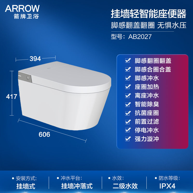 天猫箭牌后排智能马桶脚感翻圈翻盖座圈加热挂墙壁挂半智能马桶AB2027