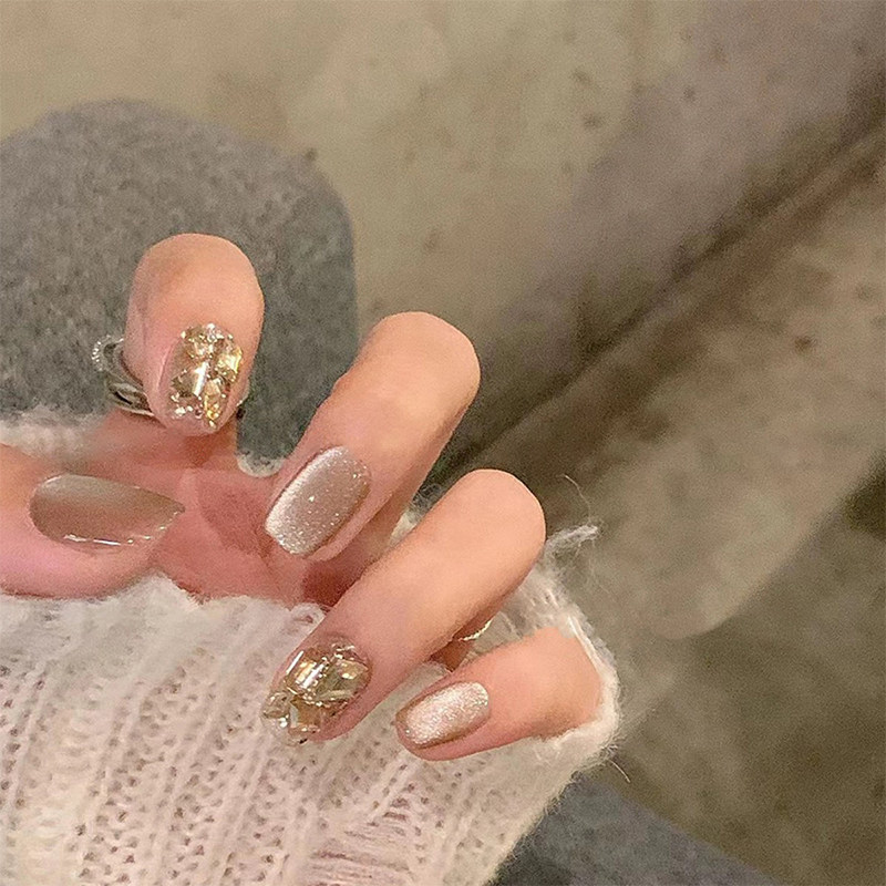 淘宝Lilynail纯欲晶石猫眼香槟钻手工穿戴甲秋冬短款2024新款美甲贴片