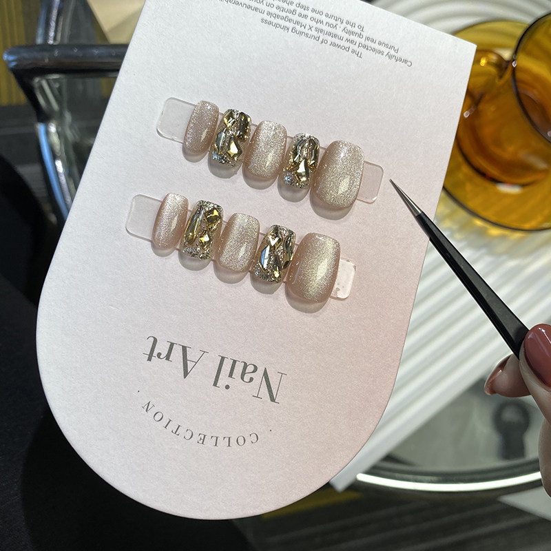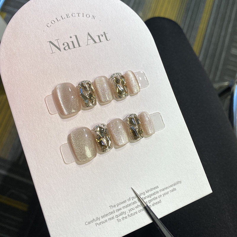 Lilynail纯欲晶石猫眼香槟钻手工穿戴甲,2024秋冬新款美甲贴片,融合纯欲美学与轻奢质感。精选香槟金色调,点缀细腻晶石与猫眼光泽,在光线下呈现梦幻渐变效果,尽显高级感。短款设计贴合亚洲甲型,佩戴舒适不累赘,适合日常通勤与约会聚会。每片均为手工镶嵌,工艺精致,甲面光滑耐磨,搭配环保果冻胶贴,轻松穿戴、拆卸无伤甲。多款甲型可选,满足不同手型需求。无论是秋冬大衣搭配,还是节日派对造型,这款美甲贴片都能为你的指尖增添一抹优雅闪耀,轻松打造精致指尖艺术。