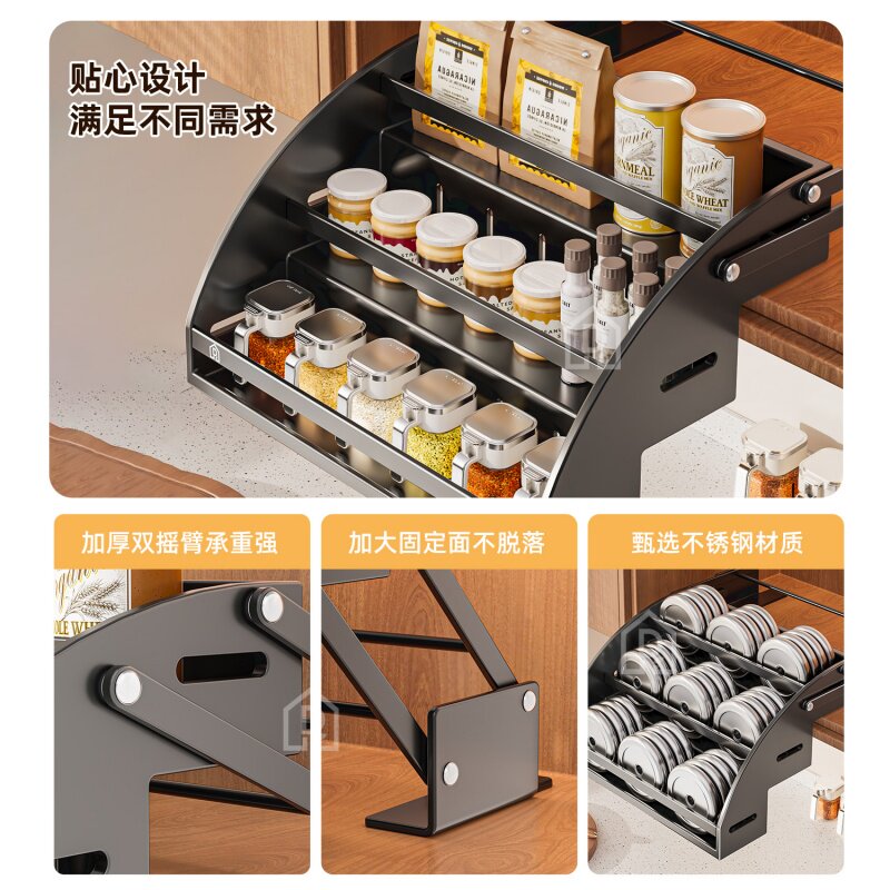天猫厨房吊柜升降不锈钢拉篮下拉式置物架多功能分格收纳架调料整理架