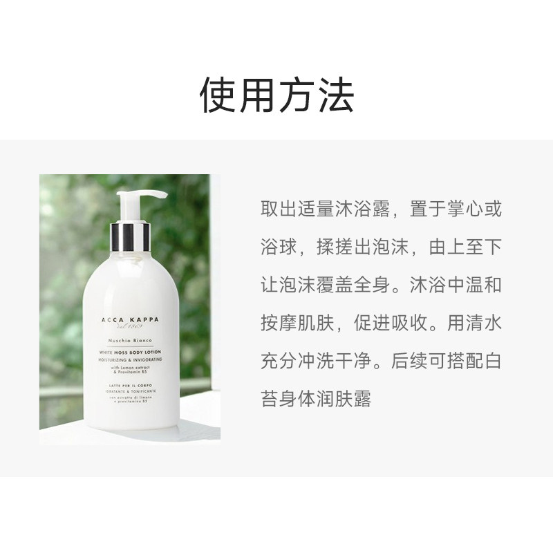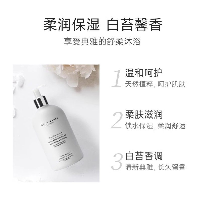 ACCA KAPPA艾克卡帕白苔沐浴露,源自意大利百年香氛世家,以清新自然的白苔香调为主调,融合柑橘、雪松与淡雅麝香,带来洁净舒缓的沐浴体验。蕴含天然植物精华,温和清洁肌肤的同时深层滋润,洗后不紧绷,触感柔滑。丰富细腻泡沫轻松带走污垢,留香持久,唤醒感官活力。500ml大容量设计,满足家庭日常使用,性价比高。简约优雅的瓶身设计,彰显品质生活格调。无论是清晨唤醒还是夜晚放松,这款沐浴露都能为你带来如森林晨雾般的清新享受,是追求自然香氛与肌肤护理人士的理想之选。