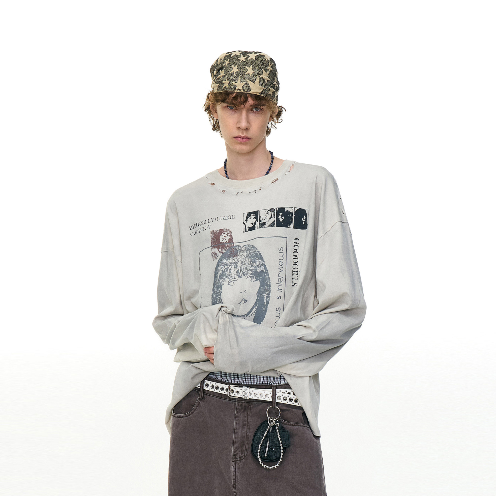 淘宝MRNEARLY 美式复古做旧破洞人物印花长袖T恤男潮牌宽松休闲上衣