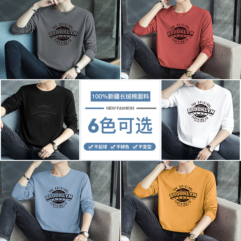 淘100%新疆棉男士T恤长袖春秋季宽松大码上衣打底衫纯色体恤秋衣