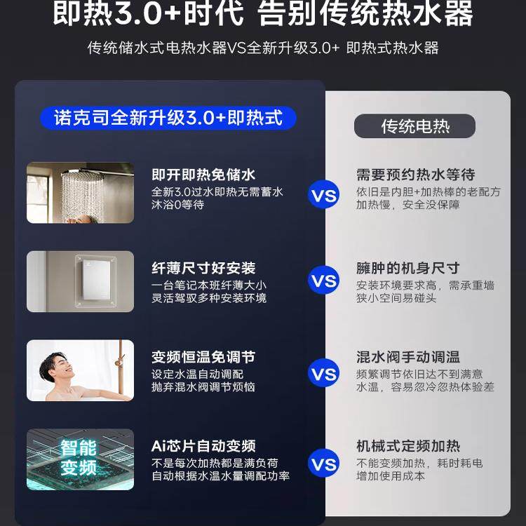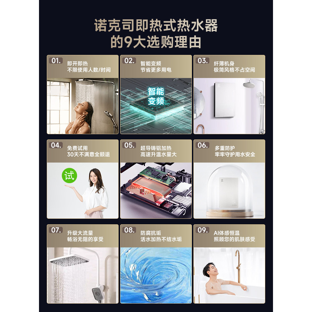 【补贴15%】诺克司恒温即热式电热水器,专为现代家庭卫生间设计,小巧机身节省空间,即开即热,无需等待。采用智能恒温技术,精准控温,告别水温忽冷忽热,沐浴更舒适。过水即热设计,节能环保,无需储水,杜绝细菌滋生,用水更健康。内置多重安全防护,防漏电、防干烧、防超压,使用更安心。功率可调,适配不同季节与用水需求,节能省电。现享政府节能补贴15%,性价比超高,是家庭升级热水体验的理想之选。安装简便,适用于新房装修或旧机替换,让温暖触手可及。