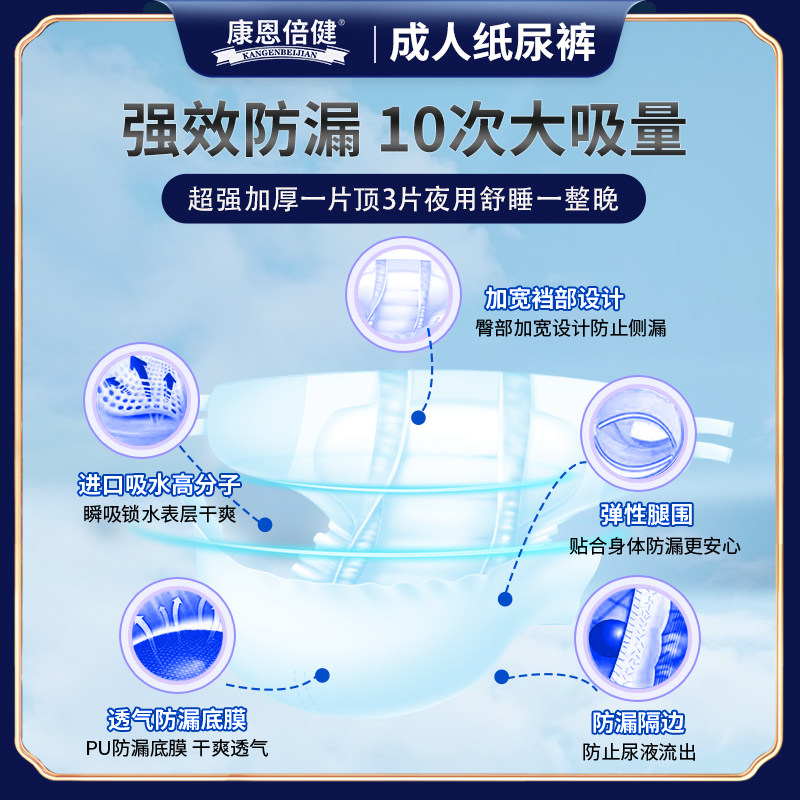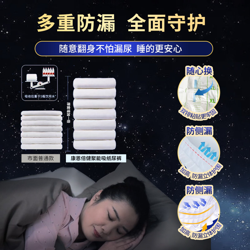 康恩倍健成人纸尿裤L码,专为夜间及重度失禁人群设计,采用加厚高吸收芯体,具备超大吸量,有效锁水防漏,整夜干爽安心。产品适用于男女成人、产妇及行动不便的老人,L码贴合腰围,弹力腰围设计舒适不勒,侧边防漏隔边有效防止侧漏。表层柔软亲肤,透气底膜减少闷热感,呵护敏感肌肤。90片装满足家庭长期护理需求,经济实用。康恩倍健专注成人护理品质,以安全、舒适、可靠赢得用户信赖,是居家照护的理想选择,让使用者安享尊严与舒适,照护者更省心省力。