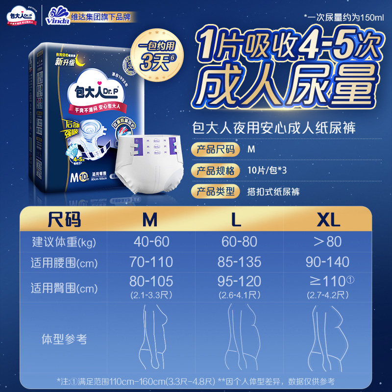 Dr.P(包大人)成人纸尿裤夜用加厚M码,专为夜间高吸收需求设计,适合中老年及失禁人群使用。采用立体防漏隔边与高弹腰围,贴合身形,有效防止侧漏;加厚芯体可快速吸收并锁住大量液体,保持表层干爽,减少夜间更换频率。M码适合腰围约80-100cm用户,柔软亲肤材质减少摩擦,呵护敏感肌肤。透气底膜设计提升舒适度,避免闷热。独立包装便于携带与储存。Dr.P品牌专注成人护理领域,以专业品质赢得信赖,是家庭照护的安心之选,让使用者安享整夜干爽与尊严。