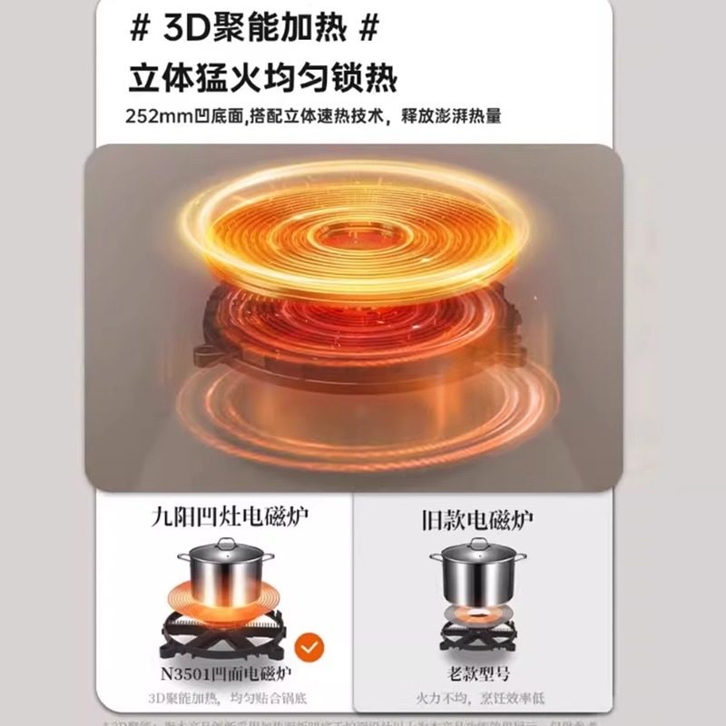 九阳凹面电磁炉家用多功能3500W大功率设计,火力强劲,爆炒、煎炸、炖煮样样精通。采用弧形凹面加热面板,更贴合传统圆底炒锅,聚能高效,受热均匀,还原中式猛火快炒的锅气。商用级性能,家用更安心,适合快节奏烹饪需求。配备多档火力调节与智能温控系统,操作简单,安全可靠。防滑支架设计稳固耐用,清洁便捷。无论是家庭厨房还是小型餐饮场所,都能轻松应对高强度使用。九阳品质保障,兼顾高效与节能,是现代厨房的理想之选,让美味烹饪更轻松、更高效。