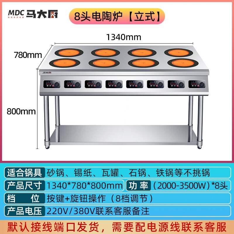商用电陶炉多头电磁炉,专为餐饮后厨高效烹饪设计,配备3500W大功率,支持2头、4头、6头及8头多种配置,满足多样化烹饪需求。采用优质面板与精准温控技术,兼容砂锅、锡纸花甲煲、煲仔炉等各式锅具,加热均匀、火力稳定,有效提升出餐效率。适用于快餐店、火锅店、夜市摊档等场景,兼具耐用性与节能性。部分型号支持独立开关与功率调节,操作简便,安全防干烧,是商用厨房的理想选择。强劲性能与灵活配置,助力高效、稳定的美食制作。