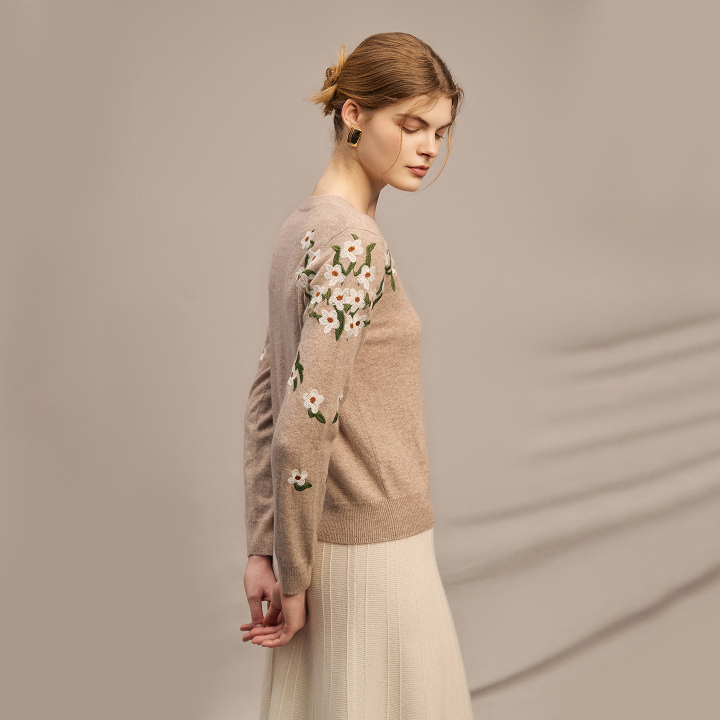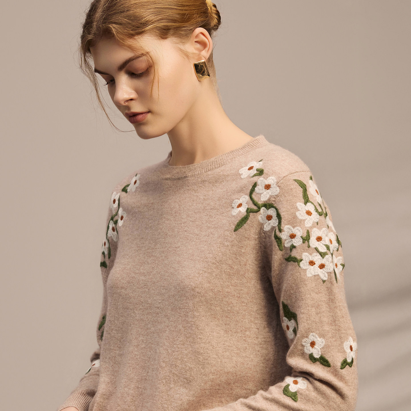 圆领100%纯山羊绒衫女秋冬新款毛衣加厚刺绣上衣高级宽松针织打底