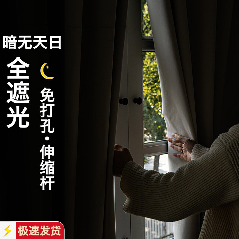 淘卧室窗帘遮光2025新款免打孔伸缩杆安装飘窗双层纱帘整套布纱一体