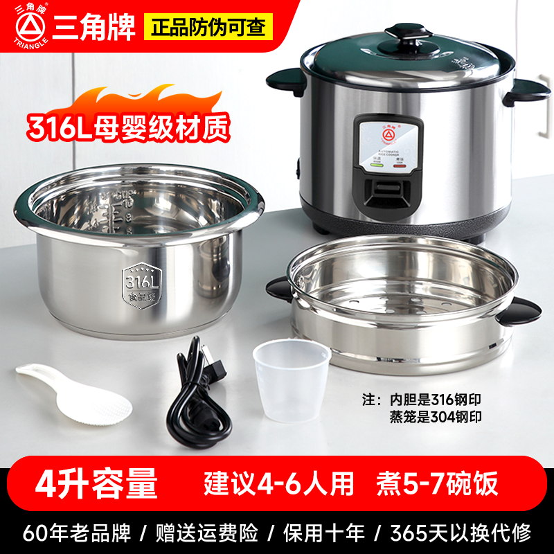 淘宝三角牌316不锈钢电饭锅正品老式小2人煮饭煲两用4-5-6L多功能家用