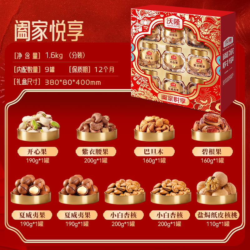 天猫沃隆坚果礼盒阖家悦享1.6kg罐装高档礼盒包装零食年货节过节送礼