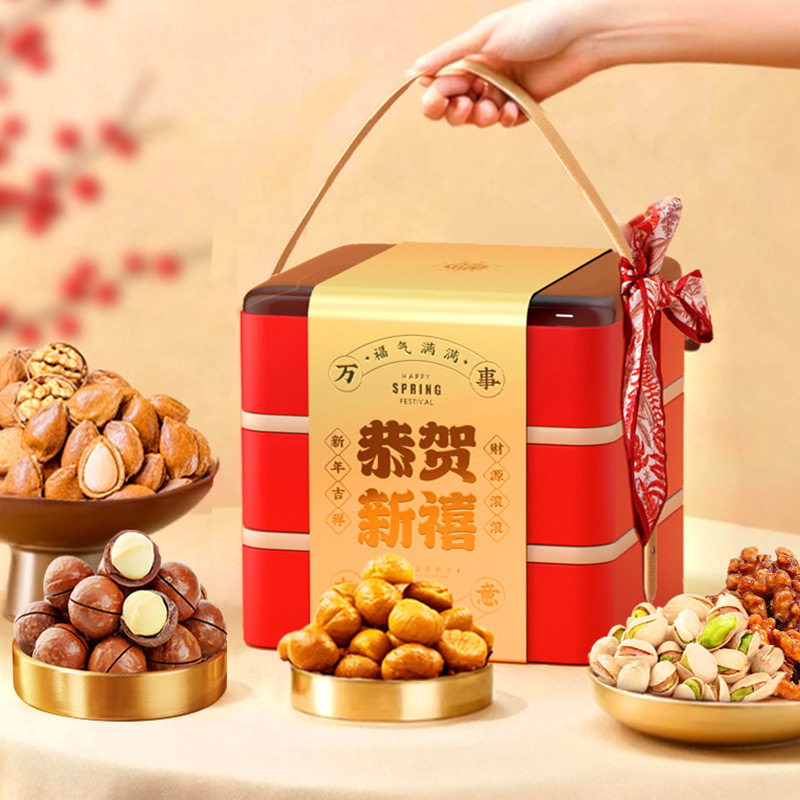 享食者年货坚果礼盒——高档福桶装,精选优质干果与坚果,包含腰果、核桃、开心果、巴旦木等十余种营养美味,颗颗饱满,口感醇香。采用传统福桶设计,寓意吉祥富贵,红金配色喜庆大气,尽显节日氛围。礼盒包装精美,支持个性化定制,是春节走亲访友、孝敬长辈的上佳之选。无论是自用还是馈赠,皆显心意与品味。享食者严选原料,层层质检,确保每一份礼盒都安全健康、品质上乘。让这份满载祝福的年货礼盒,传递浓浓年味与温情,为佳节增添一份温馨与体面。